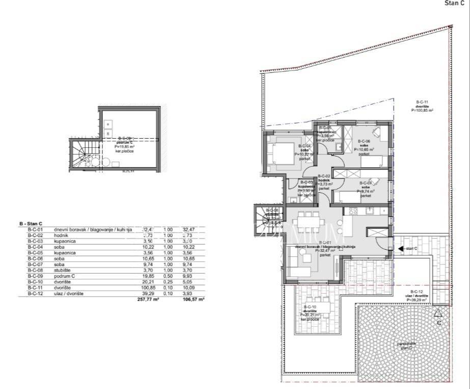 Ostava u podrumu površine od 19,85 m2 također pripada ovome stanu.