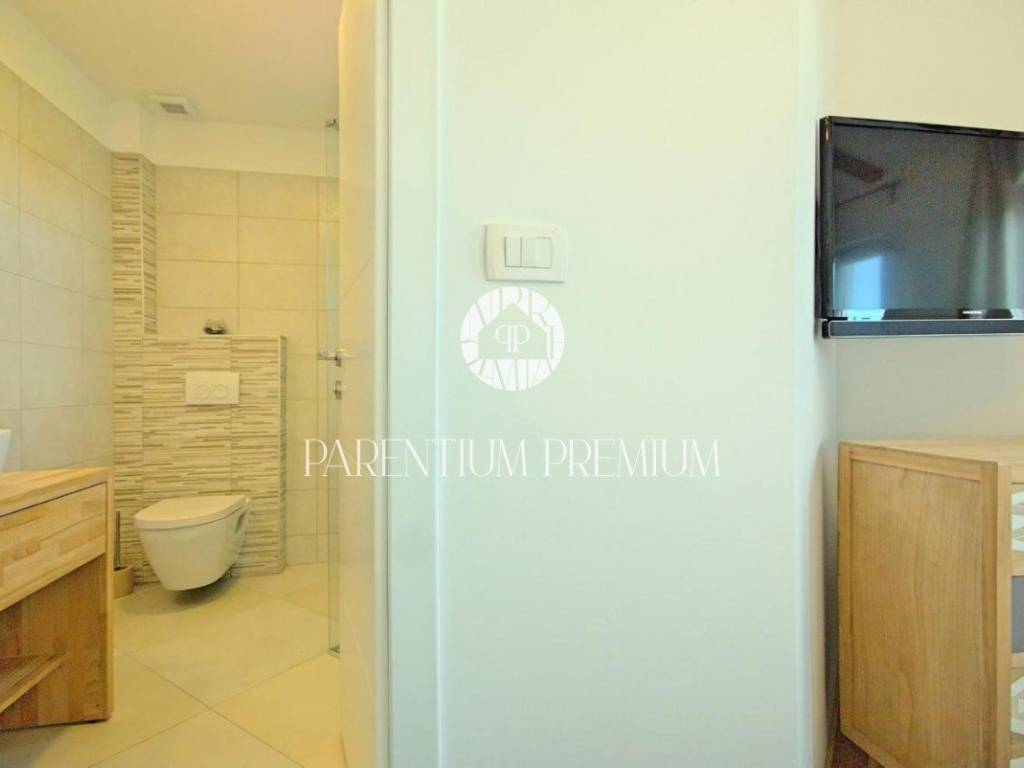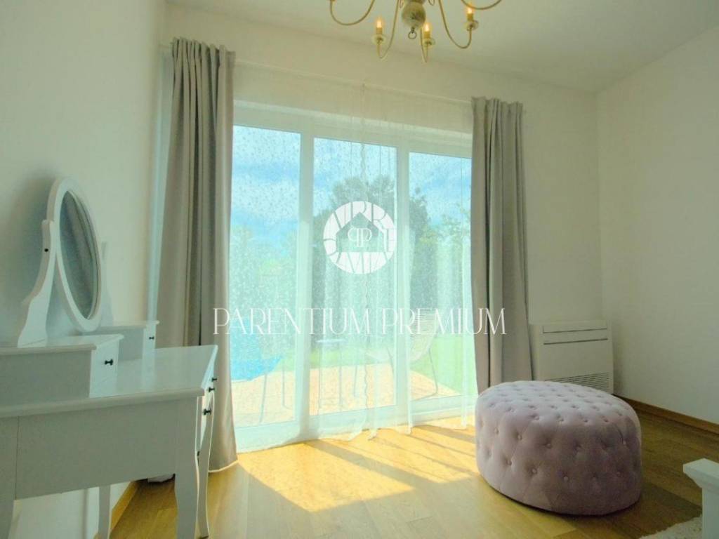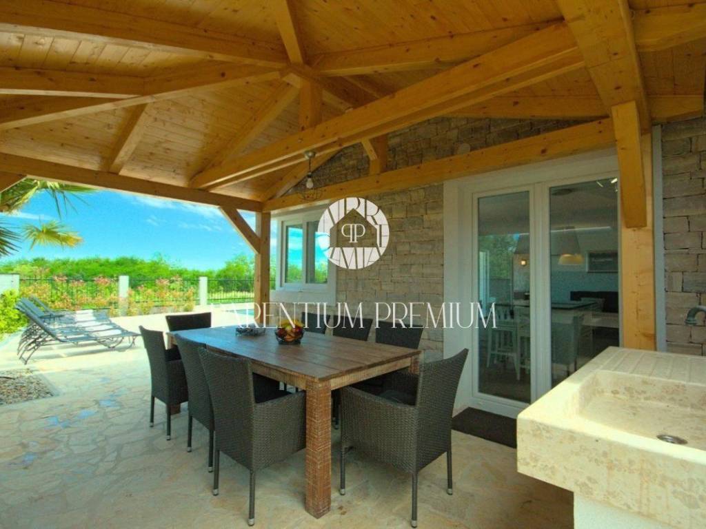 Kroz staklene stijene u dnevnom boravku izlazi se na terasu koja vodi u prekrasno uređenu okućnicu na kojoj se nalazi bazen sa sunčalištem, jacuzzi, sauna, dodatno spremište te ljetna kuhinja.