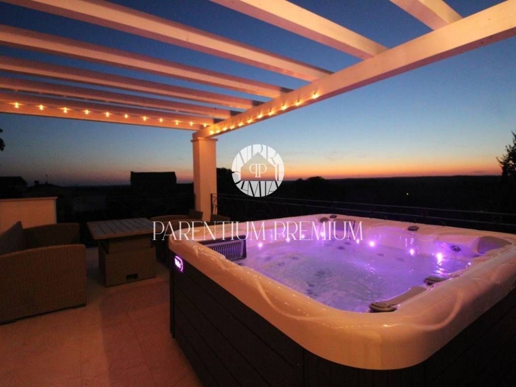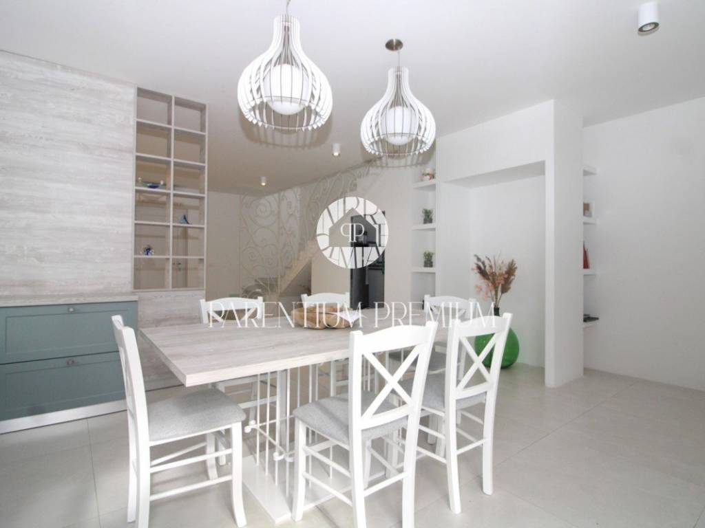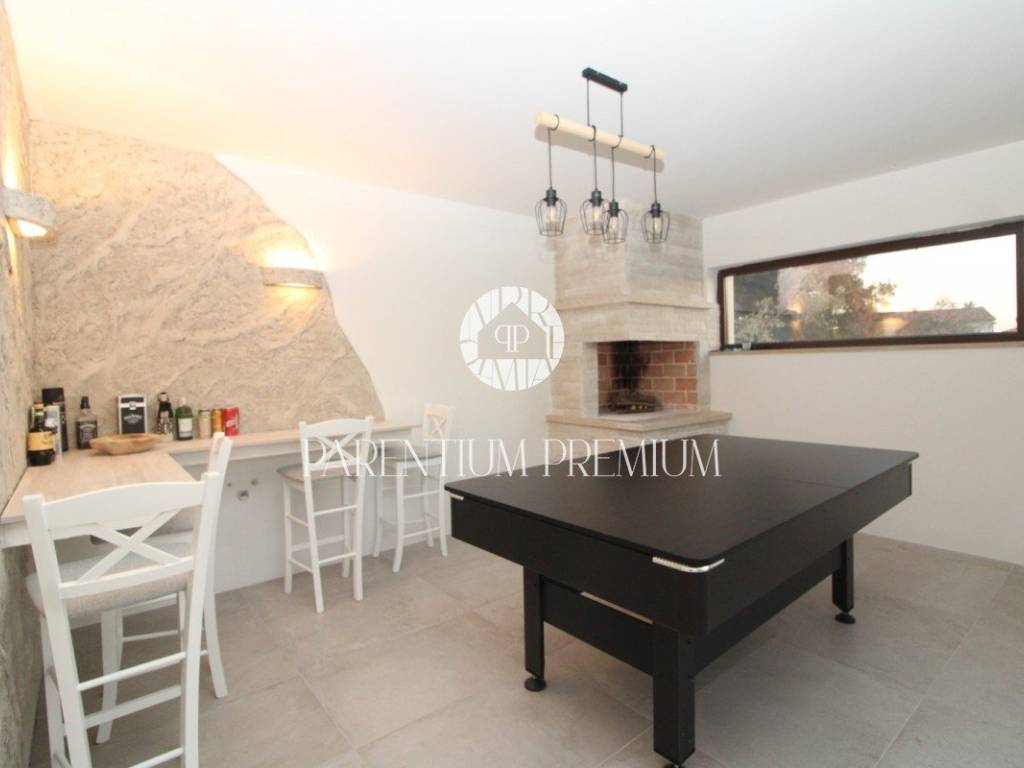 Kuća je koncipirana kao dvokatni objekt s pažljivo razmještenim prostorijama koje će ispuniti sve vaše potrebe.Prizemlje ove kuće impresionira svojim open space konceptom. Kuhinja je elegantno povezana s prostranim dnevnim boravkom i blagovaonicom, stvarajući tako idealno mjesto za obiteljske obroke i druženje s prijateljima. Također se u prizemlju nalazi praktičan gostinjski wc. Posebna prostorija za opuštanje, smještena u prizemlju, nudi dodatni luksuzni dodir ovoj kući. Ovdje ćete pronaći biljar, kamin i šank, stvoreni kako biste uživali u trenucima sa svojim gostima. Prizemlje ima dva izlaza na terasu koja vodi do sunčališta uz bazen i roštilja, savršenog za ljetne zabave i opuštanje na otvorenom.