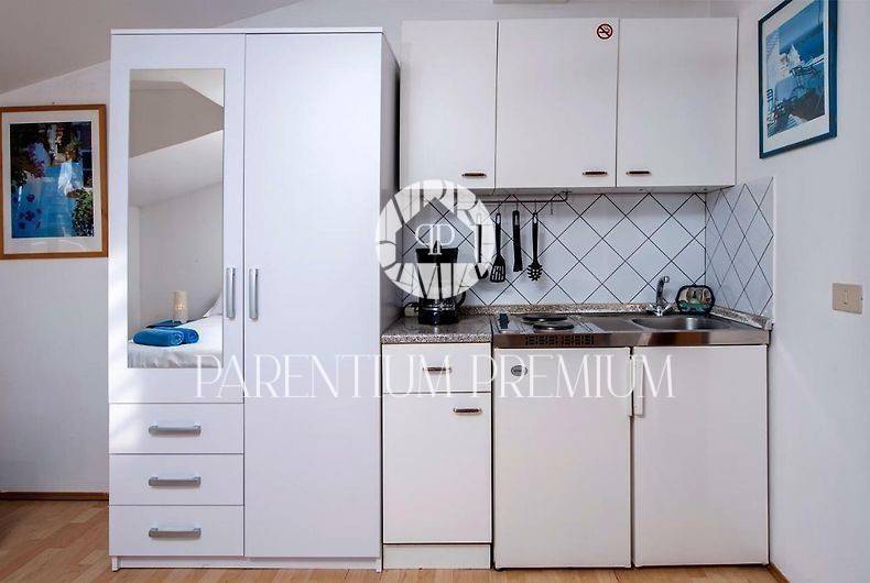 Peti apartman: Ovaj studio apartman ima terasu s pogledom na more i okolicu, potpuno opremljenu kuhinju i kupaonicu.