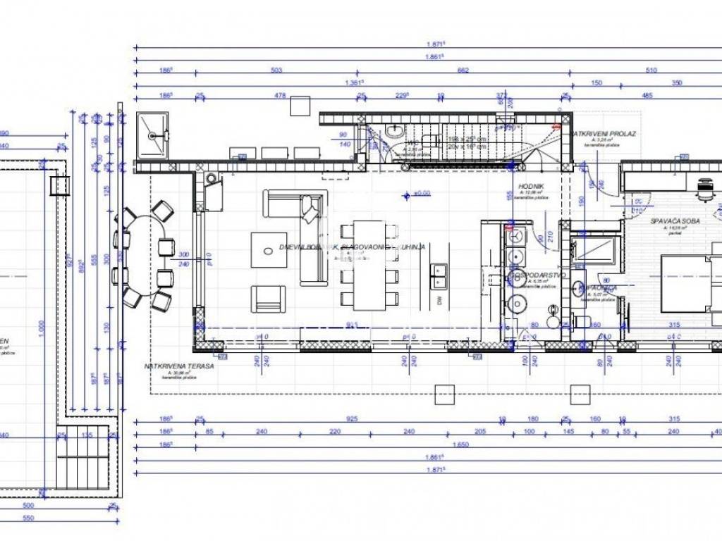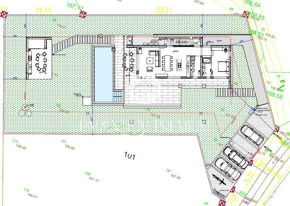 U dvorištu koje će biti ograđeno smjestit će se bazen površine od 36m2 sa sunčalištem te ljetna kuhinja i spremište. Svakako je važno spomenuti kako će i zeleni pojas oko kuće biti uređen mediteranskim biljem i opremljen sustavom automatskog navodnjavanja.