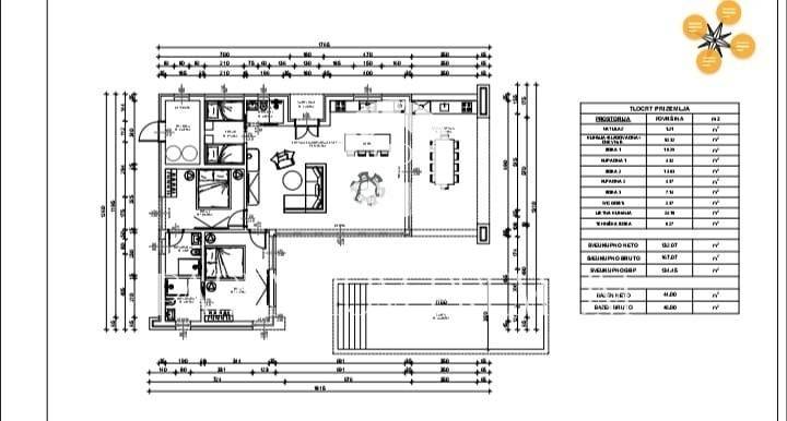 Kuća površine 132 m2 nalazi se na zemljištu površine 600 m2. Sastojat će se od ulaznog prostora, velikog dnevnog boravka sa kuhinjom i blagavaonicom, wc-a te 3 spavaće sobe i dva kupatila. Dvorište kuće će činit ljetna kuhinja, sunčalište te bazen površine 44 m2. Po cijeloj kući će biti postavljeno podno grijanje putem dizalice topline, te klima uređaji u svim prostorijama.
