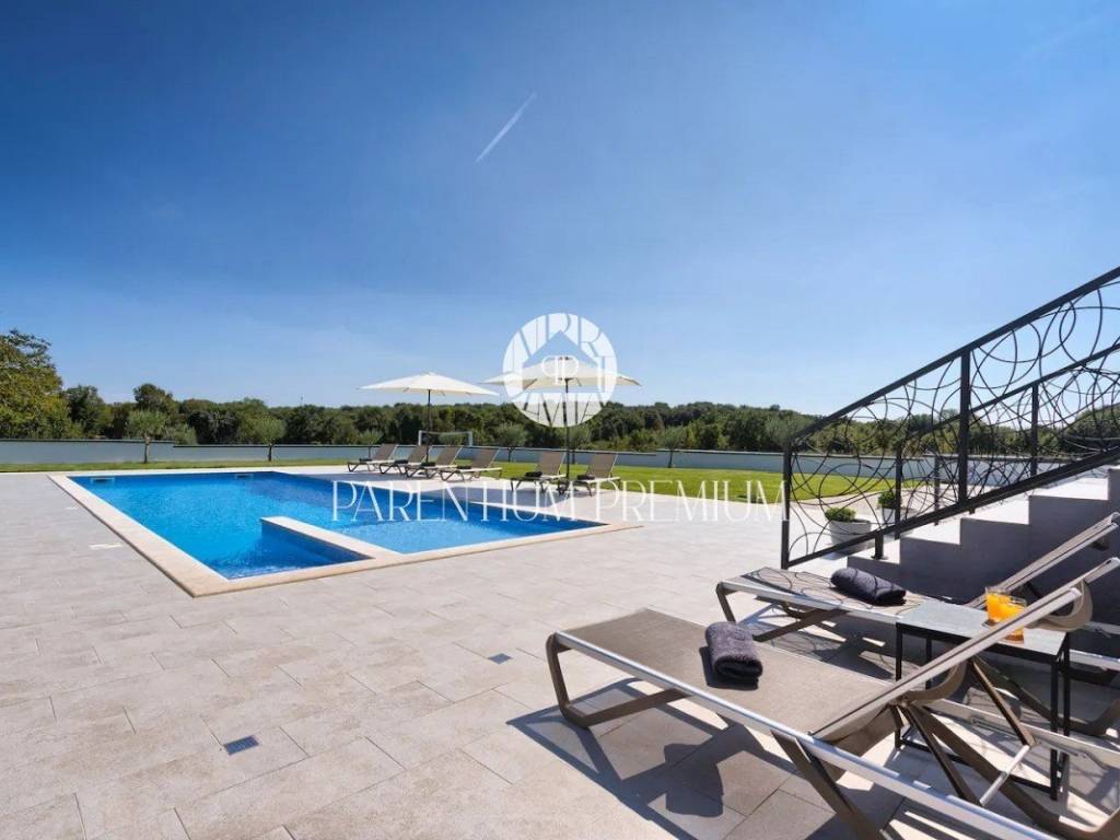 Predivna, zelena okućnica obuhvaća bazen površine 64 m, prostrano sunčalište s vanjskim tušem, ručno izrađeni kameni kamin uz veliki natkriveni prostor za objed, pružajući idealno mjesto za uživanje u predivnom okruženju.