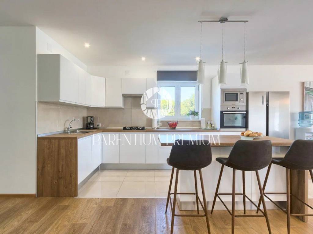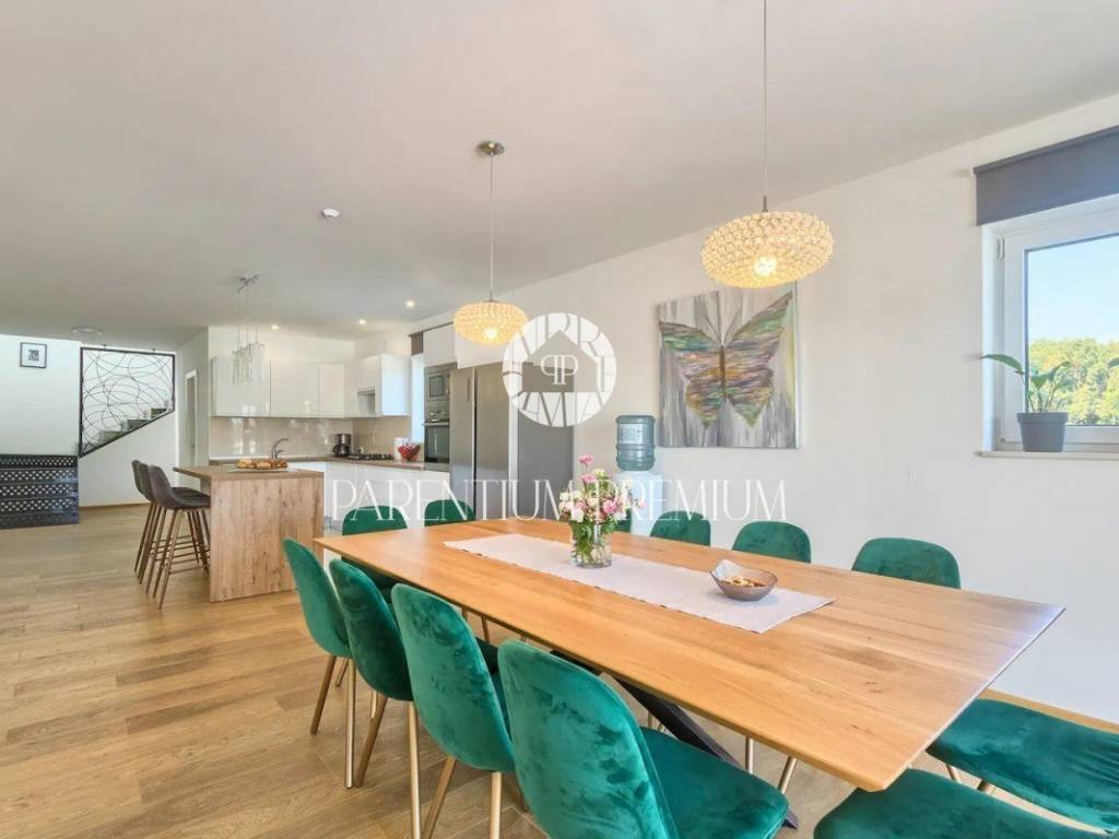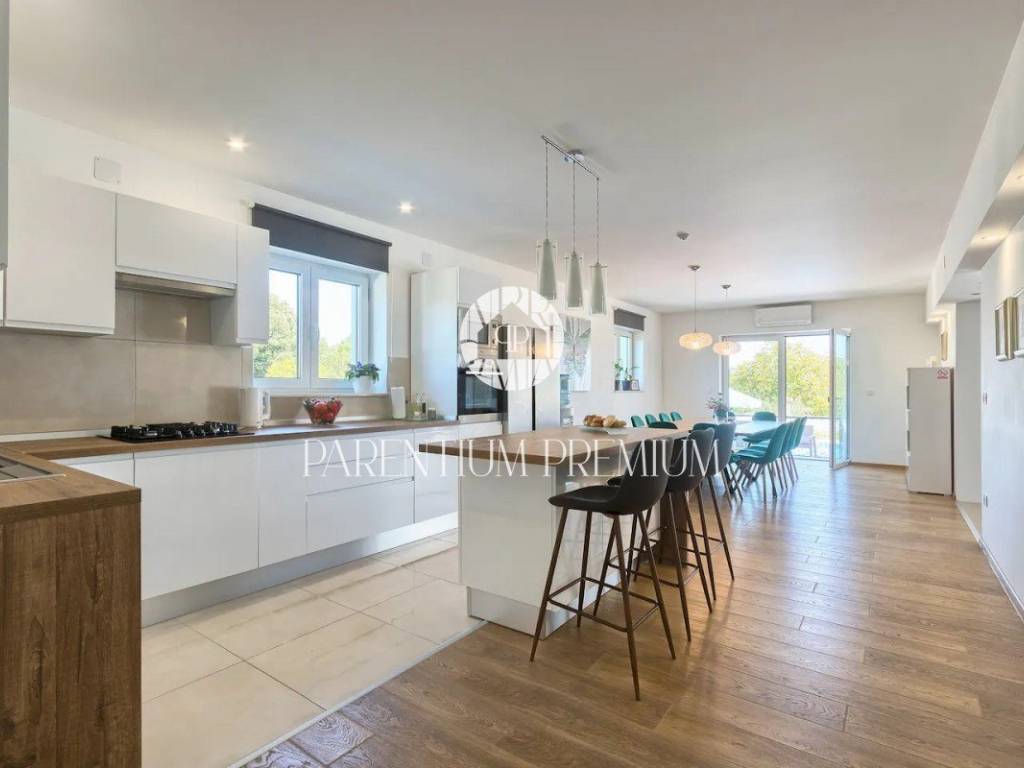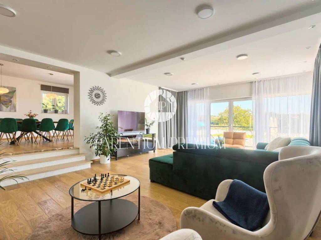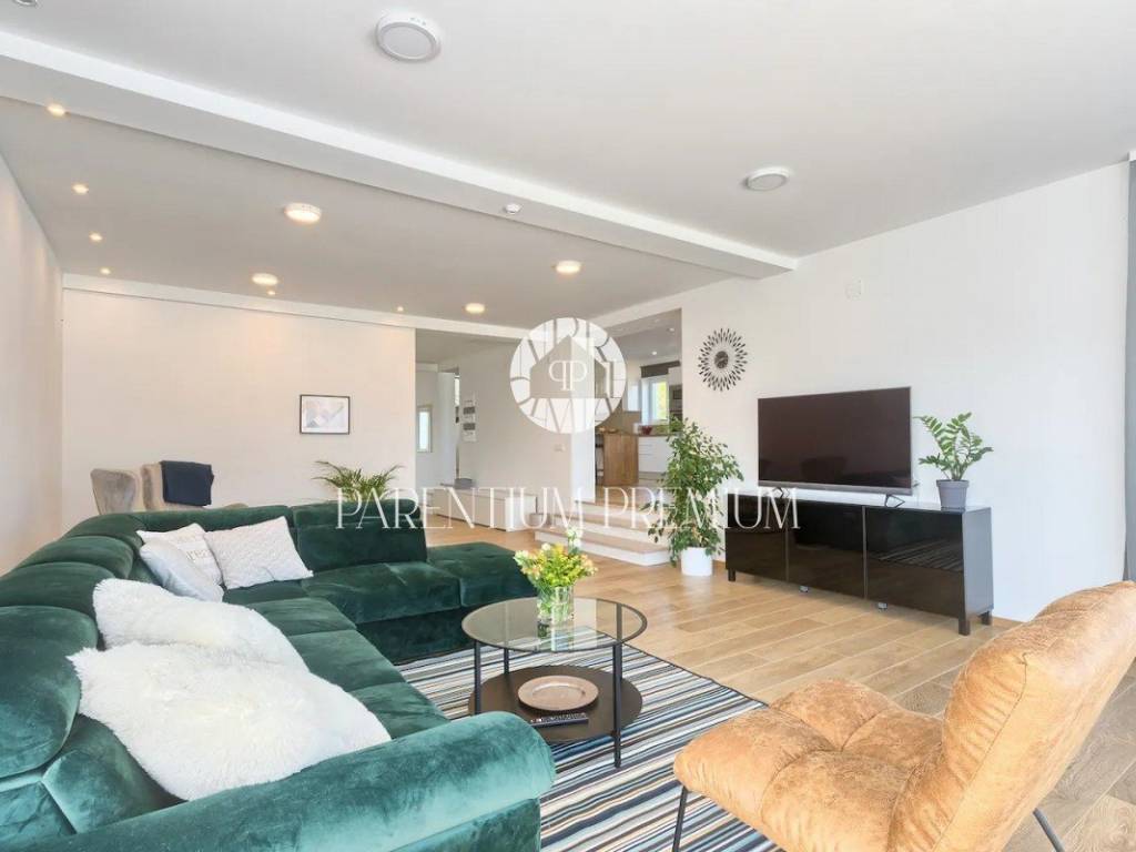 Suteren, prva etaža, proteže se duž cijele površine kuće, pružajući budućem vlasniku raznolike mogućnosti korištenja - od konobe, teretane do wellness prostora ili igraonice. Na prizemlju (190 m) nalazi se prostran dnevni boravak s izlazom na terasu i vrt, kuhinja opremljena vrhunskim aparatima, prostrani prostor za objed, prozračna spavaća soba te moderno kupatilo.