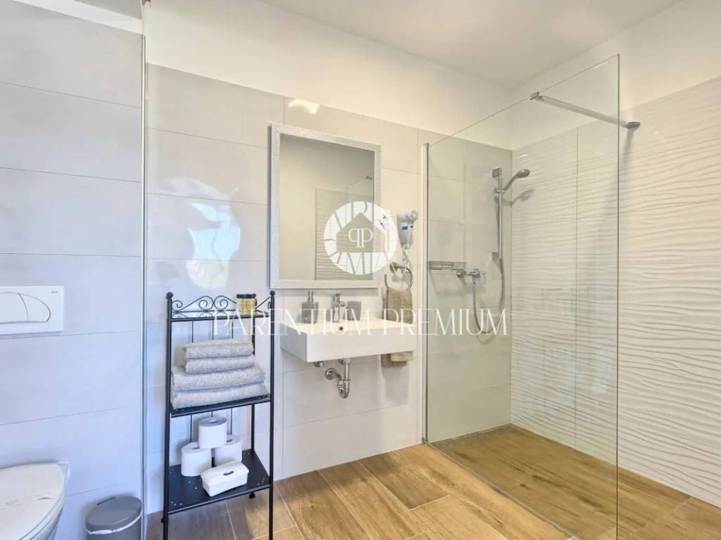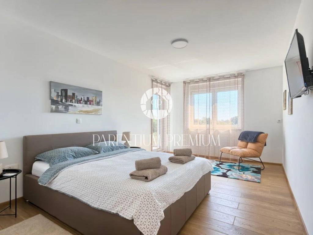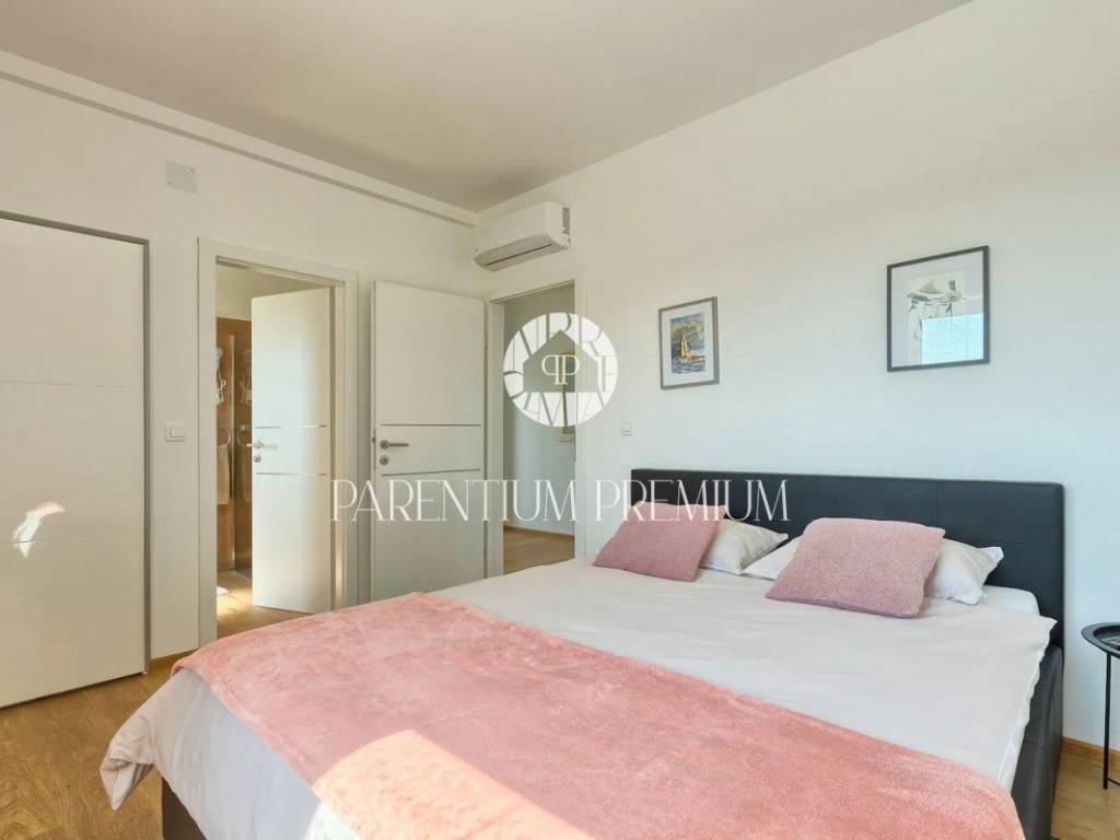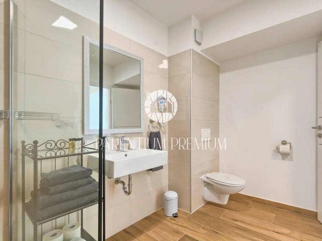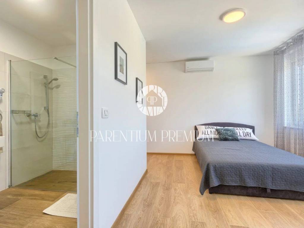 Suteren, prva etaža, proteže se duž cijele površine kuće, pružajući budućem vlasniku raznolike mogućnosti korištenja - od konobe, teretane do wellness prostora ili igraonice. Na prizemlju (190 m) nalazi se prostran dnevni boravak s izlazom na terasu i vrt, kuhinja opremljena vrhunskim aparatima, prostrani prostor za objed, prozračna spavaća soba te moderno kupatilo.