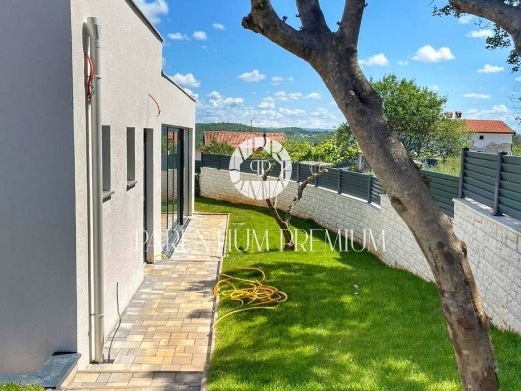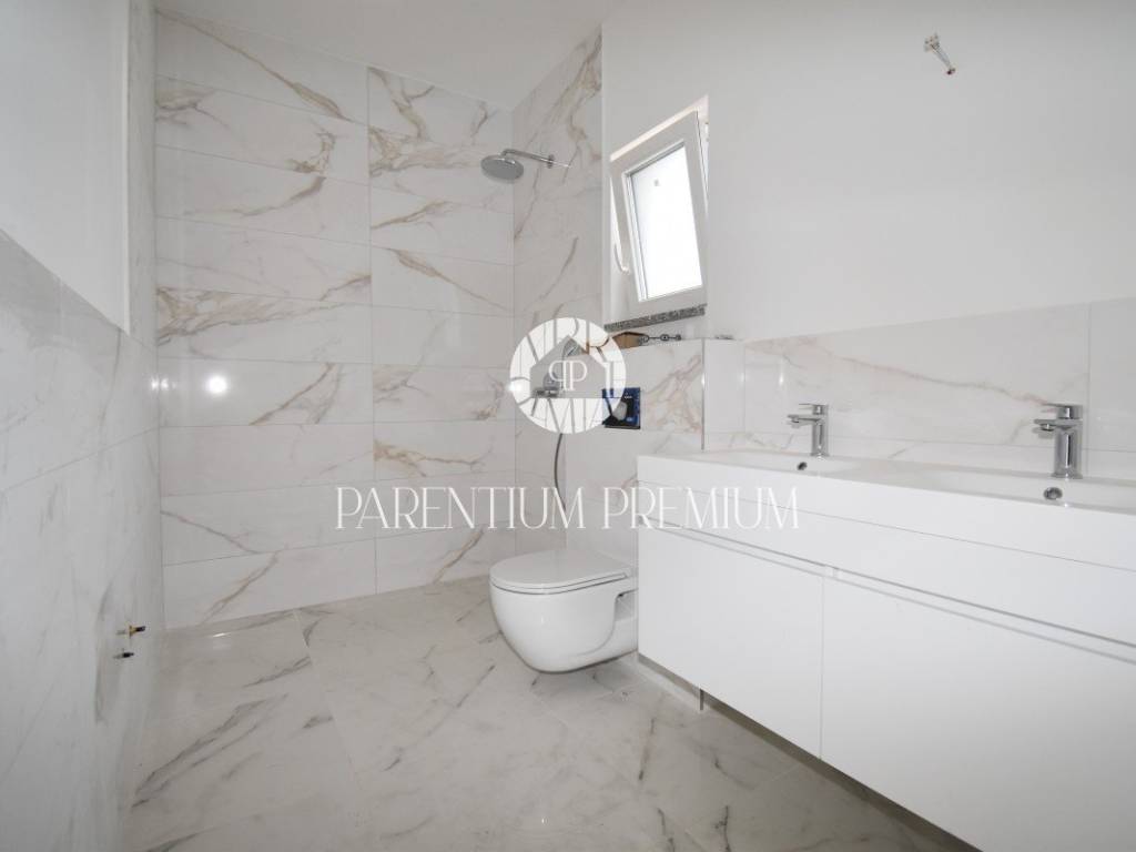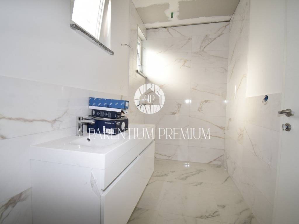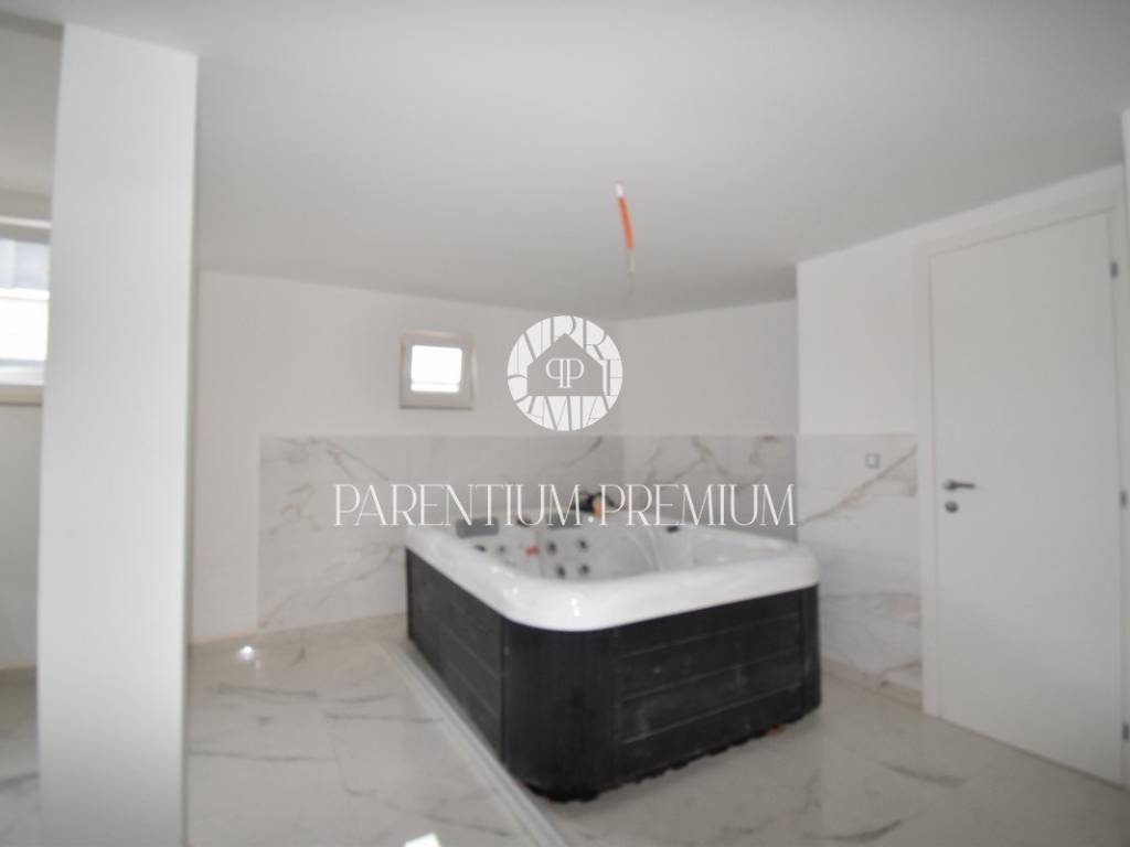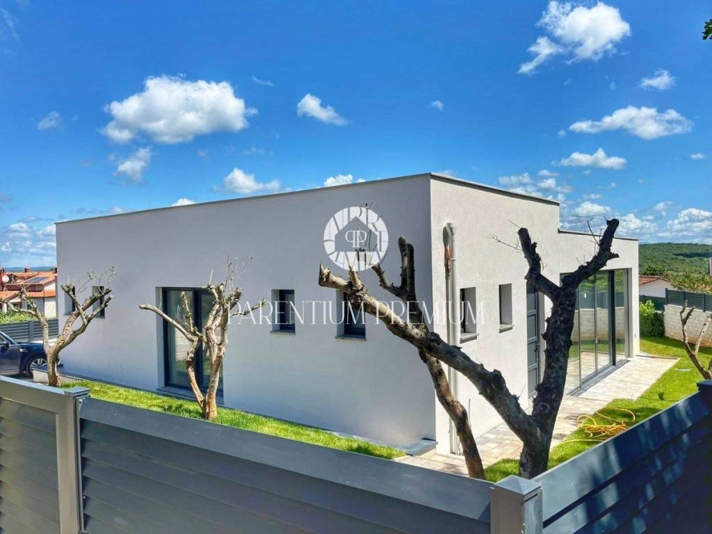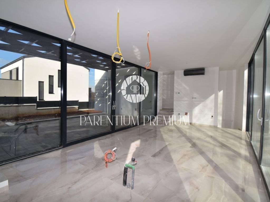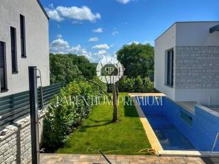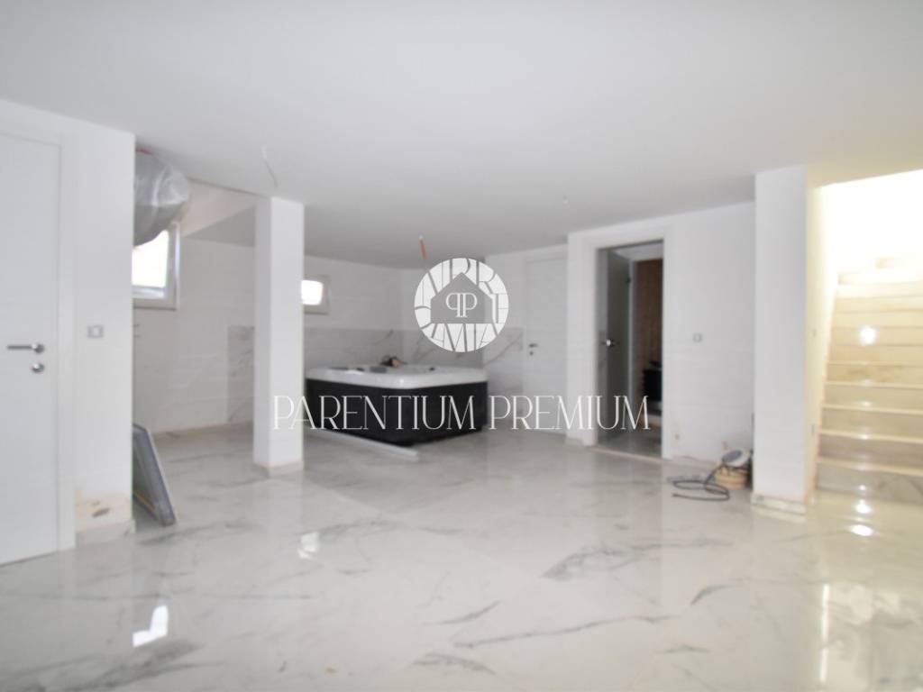 U srcu mjesta na ograđenoj parceli ukupne površine 551m2 smjestila se ova nova kuća površine 218m2. Sastoji se od otvorenog dnevnog boravka sa kuhinjom koji je bogat prirodnom svjetlošću zbog velikih staklenih stjena, izlazom na natkrivenu terasu, četiri spavaće sobe svaka sa vlastitim kupaonicama koje su kompletno opremljene sanitarijama, te dodatnog WC-a za goste. Podrum kuće čini wellness soba gdje se nalazi sauna, jacuzzi i jedan wc. Kuća je opremljena PVC stolarijom, dizalicom topline, podnim grijanjem te sa 6 klimatskih jedinica.. Okućnica i dvorište zaštićeni su videonadzorom te su osigurana 3 parkirna mjesta.