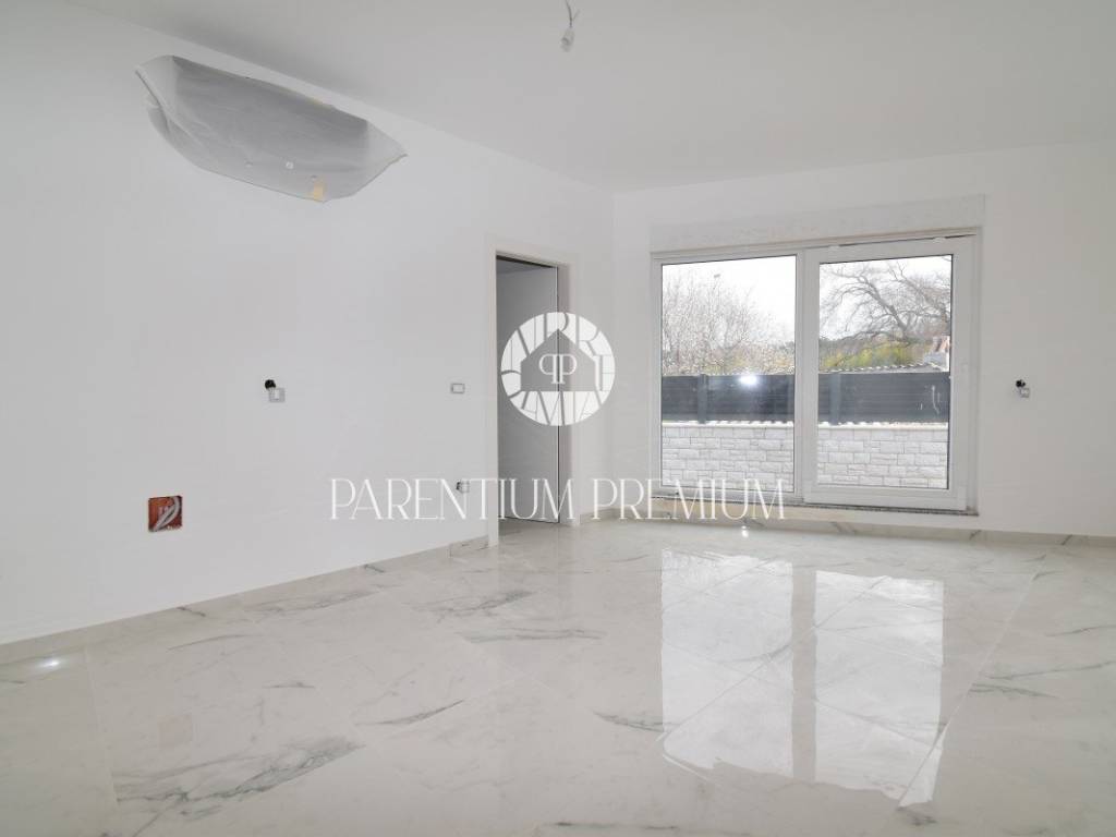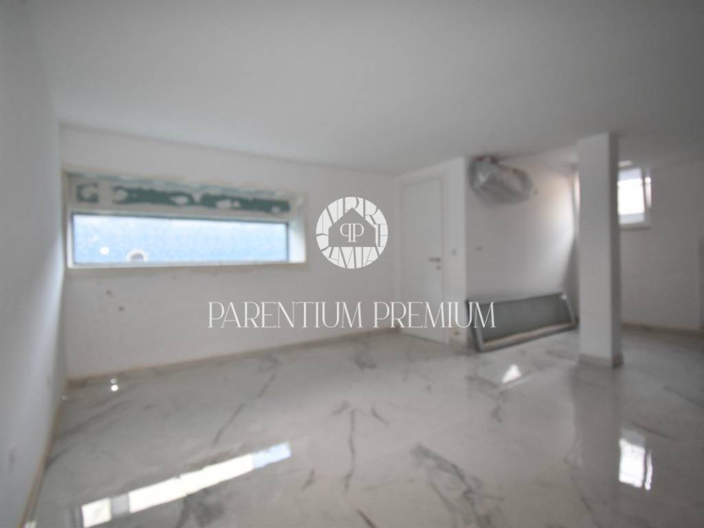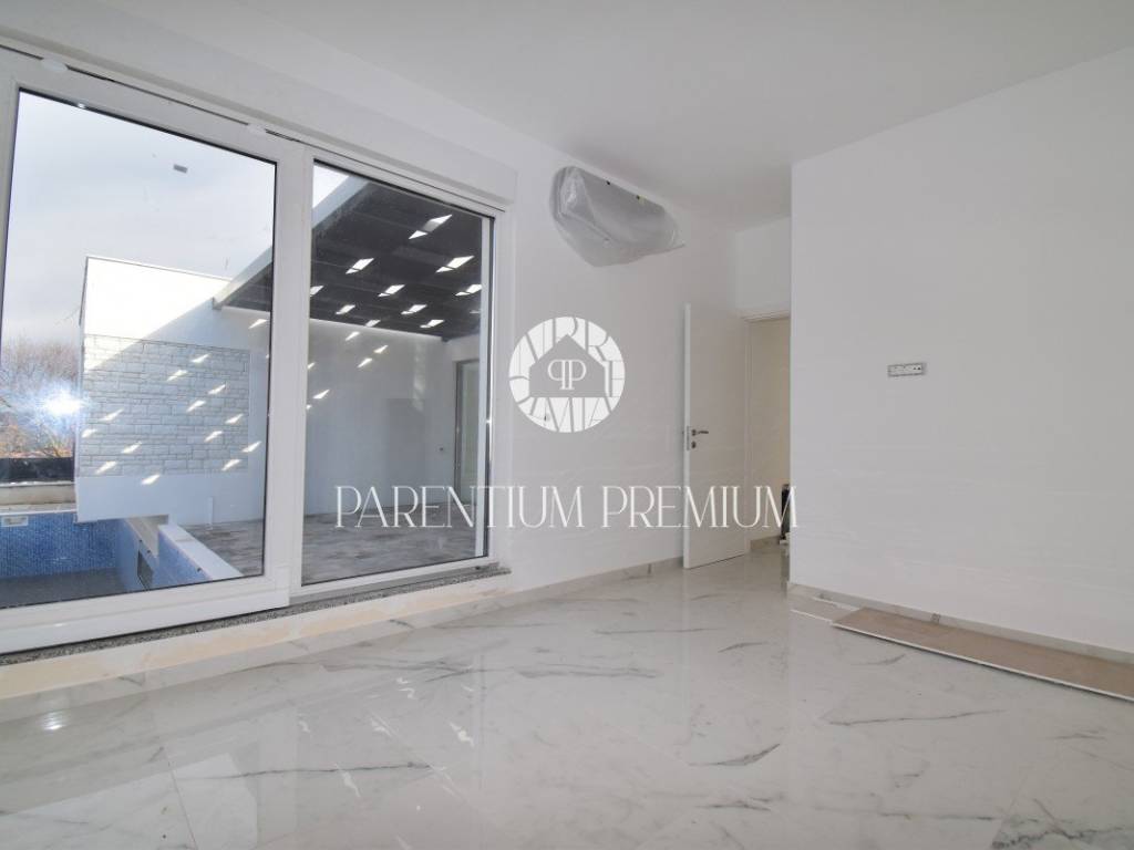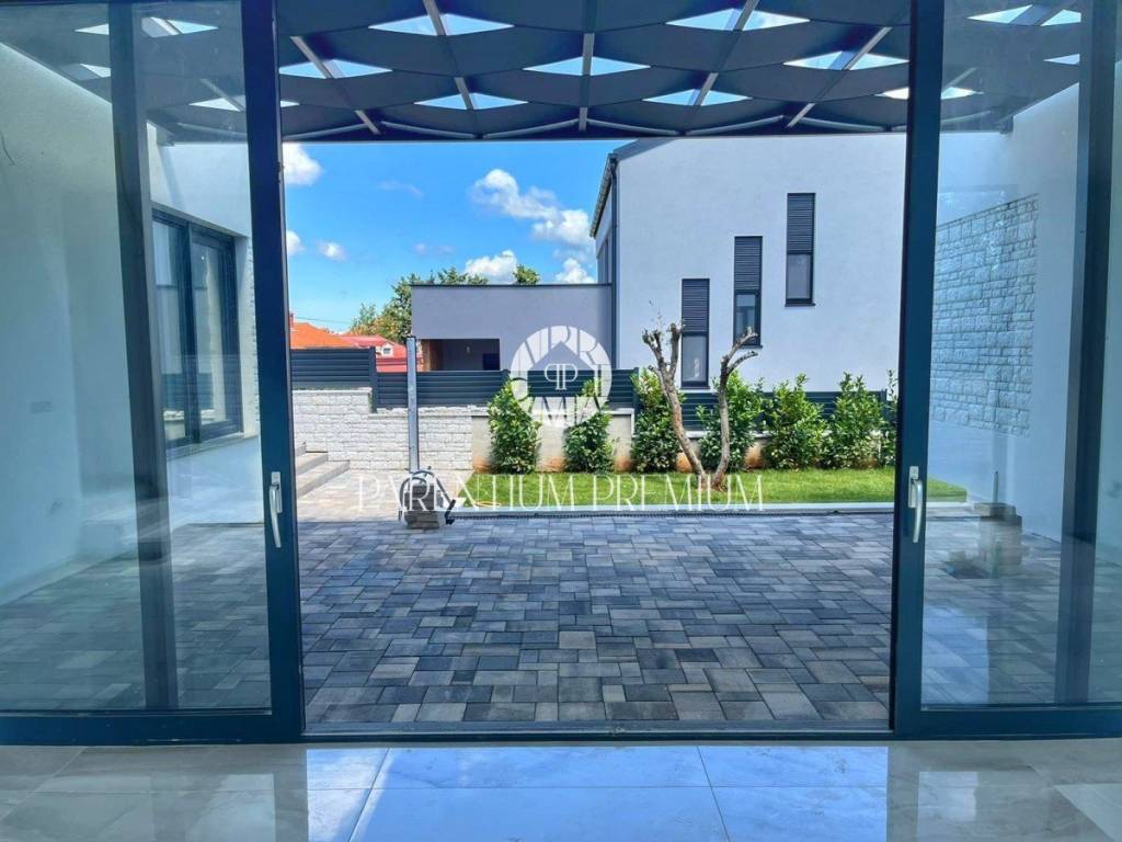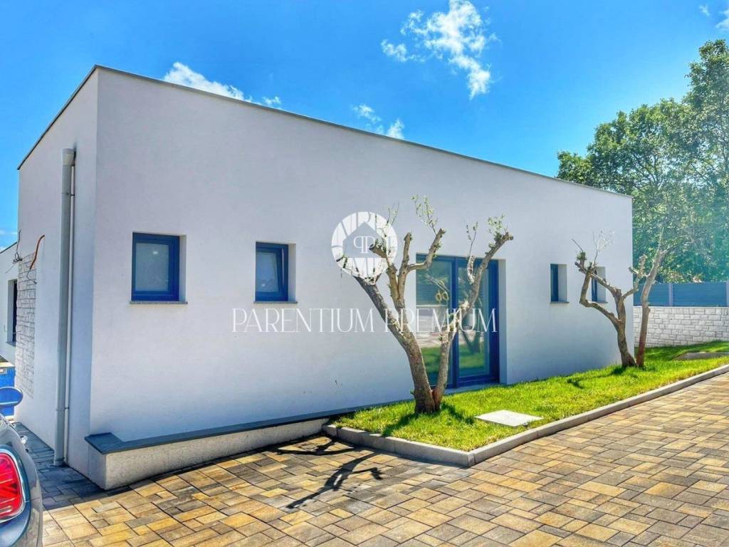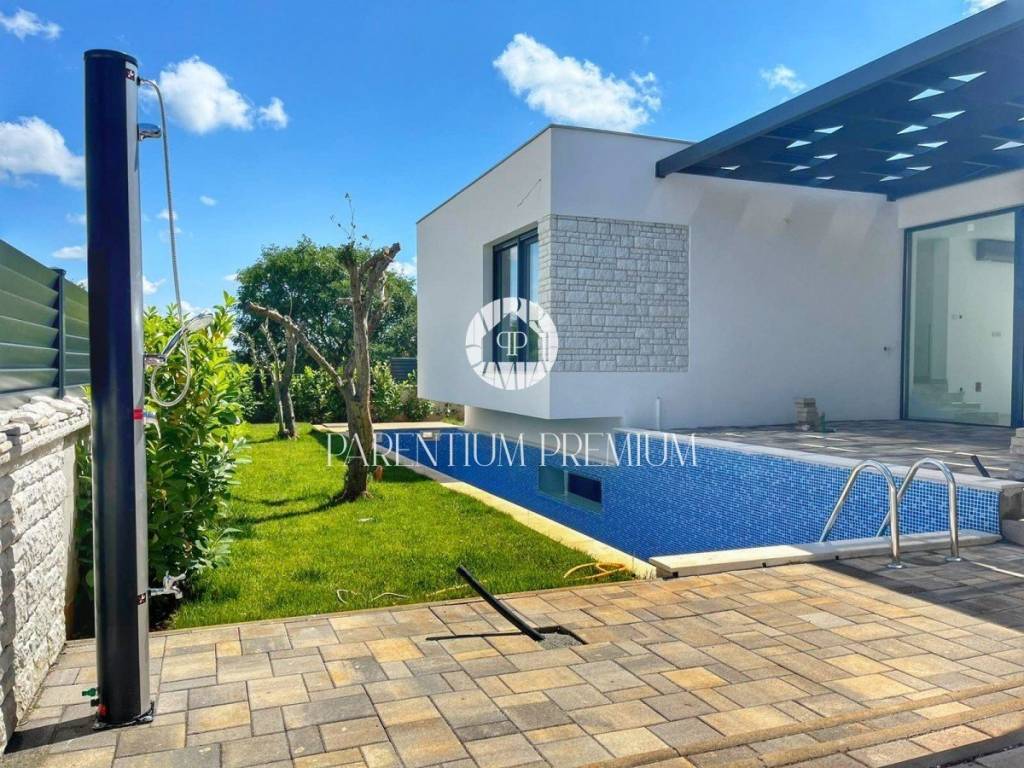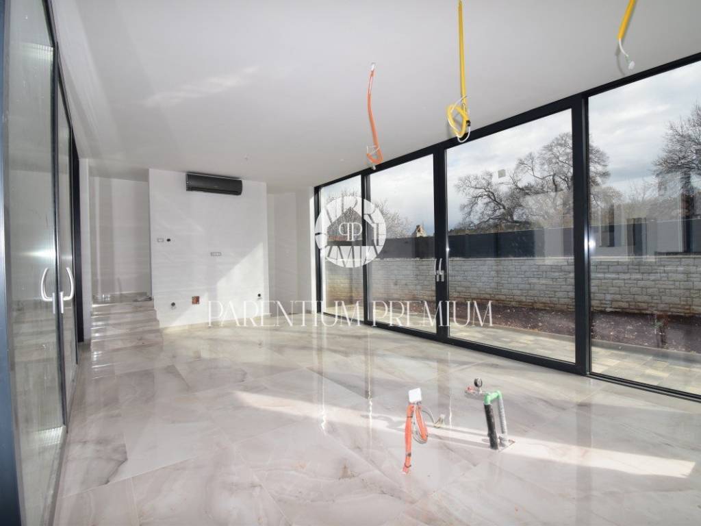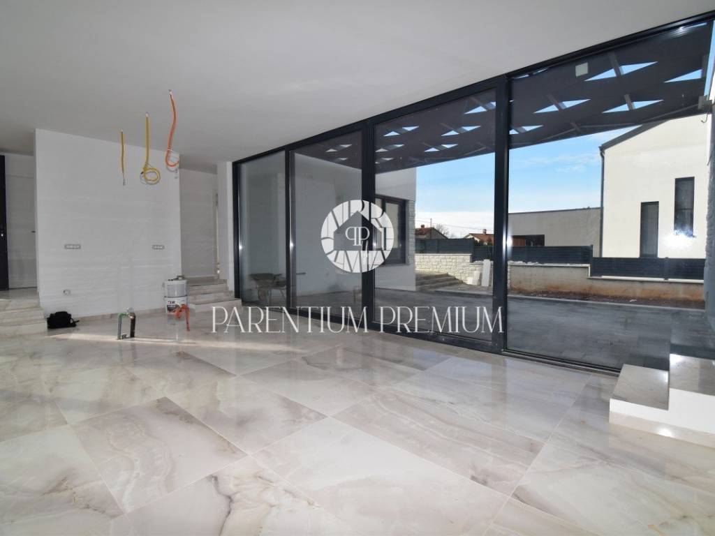 U srcu mjesta na ograđenoj parceli ukupne površine 551m2 smjestila se ova nova kuća površine 218m2. Sastoji se od otvorenog dnevnog boravka sa kuhinjom koji je bogat prirodnom svjetlošću zbog velikih staklenih stjena, izlazom na natkrivenu terasu, četiri spavaće sobe svaka sa vlastitim kupaonicama koje su kompletno opremljene sanitarijama, te dodatnog WC-a za goste. Podrum kuće čini wellness soba gdje se nalazi sauna, jacuzzi i jedan wc. Kuća je opremljena PVC stolarijom, dizalicom topline, podnim grijanjem te sa 6 klimatskih jedinica.. Okućnica i dvorište zaštićeni su videonadzorom te su osigurana 3 parkirna mjesta.
