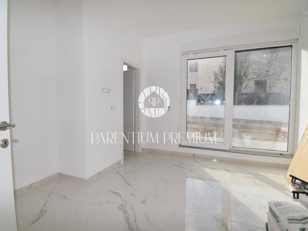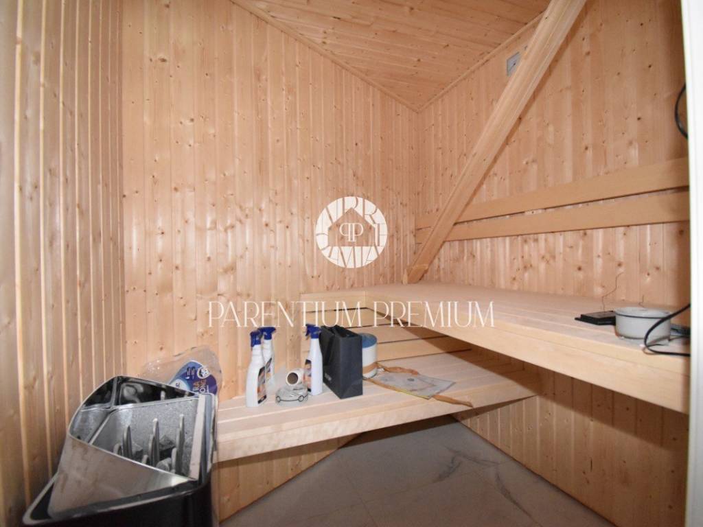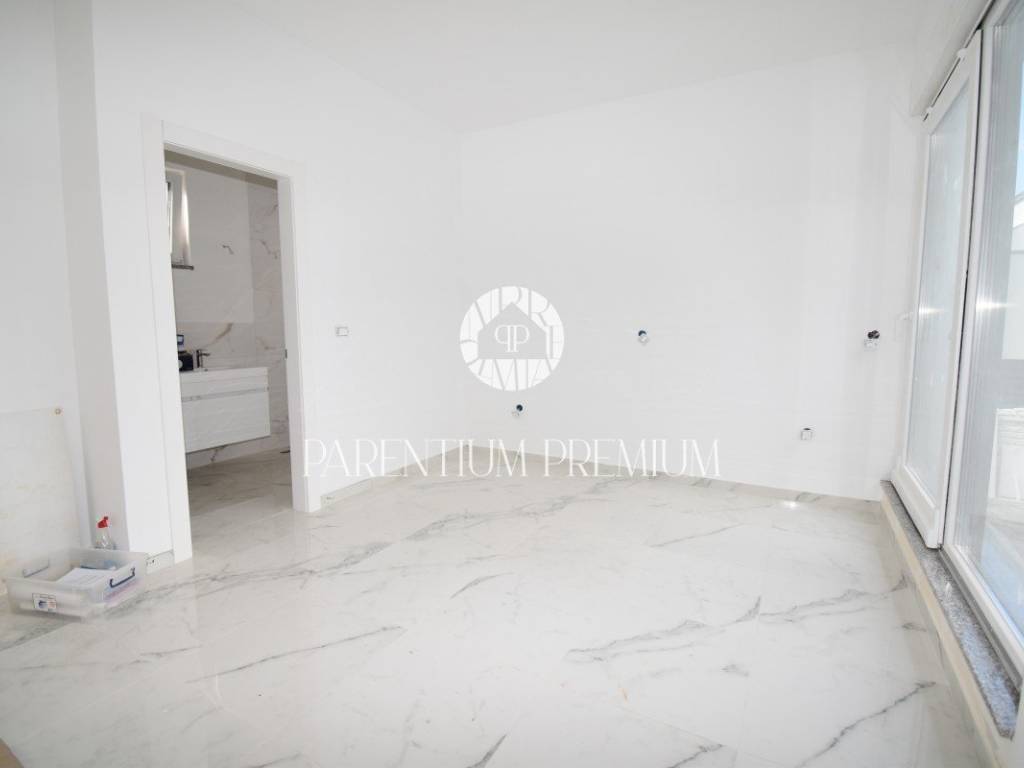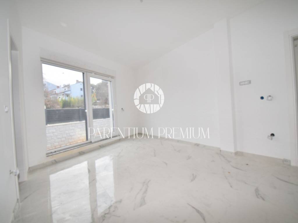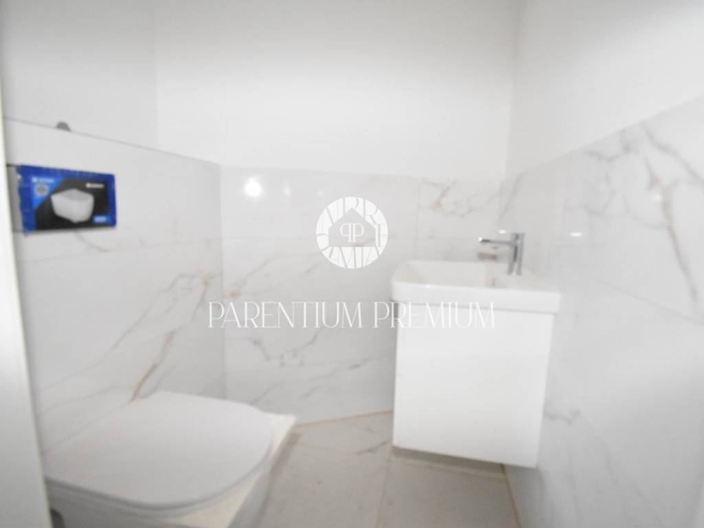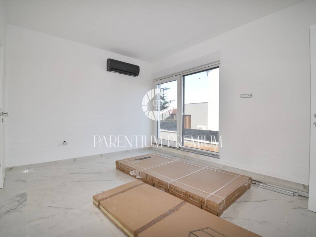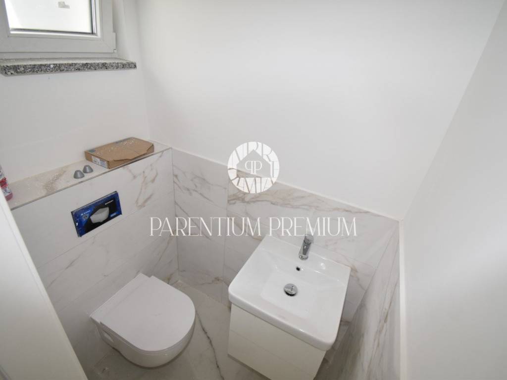 U srcu mjesta na ograđenoj parceli ukupne površine 551m2 smjestila se ova nova kuća površine 218m2. Sastoji se od otvorenog dnevnog boravka sa kuhinjom koji je bogat prirodnom svjetlošću zbog velikih staklenih stjena, izlazom na natkrivenu terasu, četiri spavaće sobe svaka sa vlastitim kupaonicama koje su kompletno opremljene sanitarijama, te dodatnog WC-a za goste. Podrum kuće čini wellness soba gdje se nalazi sauna, jacuzzi i jedan wc. Kuća je opremljena PVC stolarijom, dizalicom topline, podnim grijanjem te sa 6 klimatskih jedinica.. Okućnica i dvorište zaštićeni su videonadzorom te su osigurana 3 parkirna mjesta.
