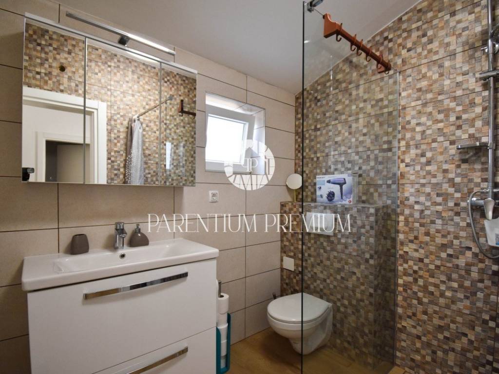 Kuća je podijeljena na 2 identične stambene cjeline. Svaka cjelina sastoji se od 2 etaže koje su podijeljene tako da na donjoj etaži imamo veliku open space kuhinju i dnevni boravak sa izlazom na terasu veličine 20m2 i bazen od 24m2 sa pripadajućim kupatilom. Na katu imamo 2 spavaće sobe sa izlazom na terasu i dodatno kupatilo.