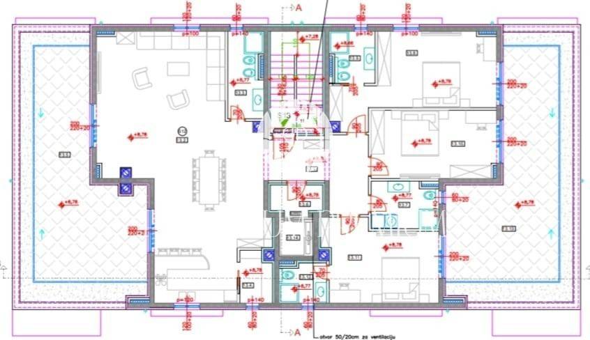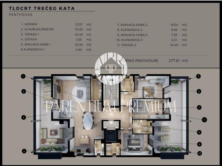 Penthouse je podijeljen na 2 dijela, s jedne strane imamo open space dnevnim boravak sa kuhinjom, blagovaonom, kuhinjskom ostavom i kupaonicom ukupne površine od 69m2. Cijeli prostor je osvijetljen dvama staklenim stijenama povezanim sa prostranom terasom sa koje se pruža umirujući panoramski pogled na more i mjesto uz moguće postavljanja dodatnog sadržaja (jacuzzi i ljetna kuhinja). S druge strane povezano elegantnim hodnikom nalazi se spavaći dio sa 3 spavaće sobe, 3 kupaonice sve povezane izlazima na zajedničku terasu idealnu za uživanje tokom cijele godine. Obje krovne terase će imati bioklimatske pergole.