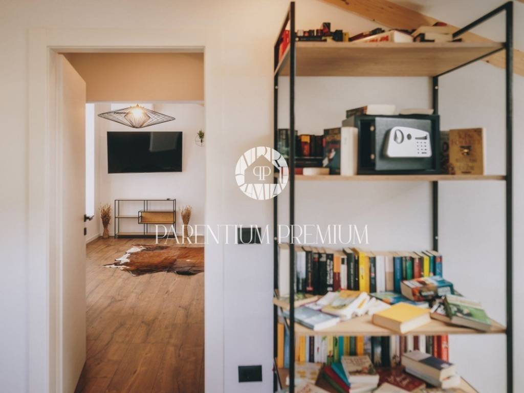 Stepenicama se dolazi na 1. kat gdje se nalazi radna soba ili biblioteka za čitanje, kupaona, tehnička soba, prostrana spavaća soba sa garderobom i balkonom.