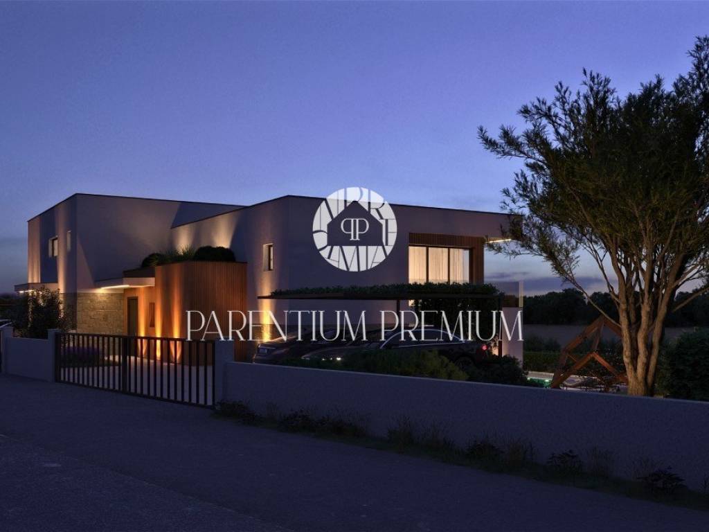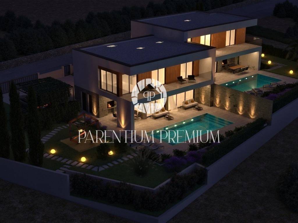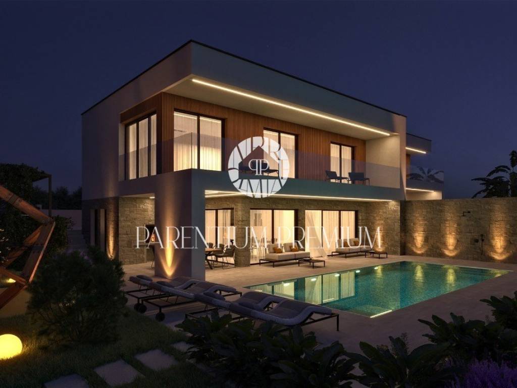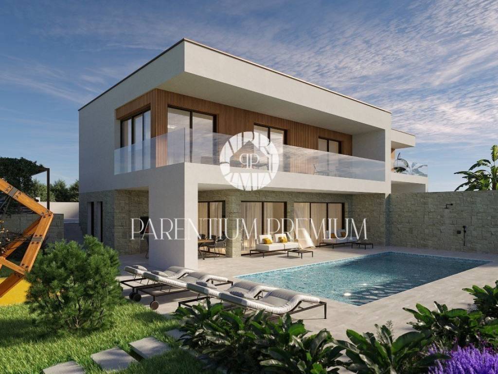 Na lijepoj i traženoj lokaciji smjestila se ova moderna te iznimno kvalitetna dvojna kuća sa grijanim bazenom i pogledom na more ukupne površine od 183,21m2.