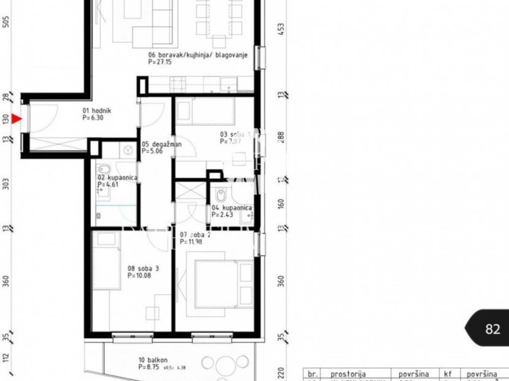 Stan se sastoji od ulaznog hodnika/garderobe, dvije kupaonice, tri spavaće sobe od kojih jedna ima vlastiti balkon, te dnevni boravak po open space konceptu, koji je osvijetljen velikom staklenom stijenom kroz koju se pristupa ugodnoj i komotnoj terasi.