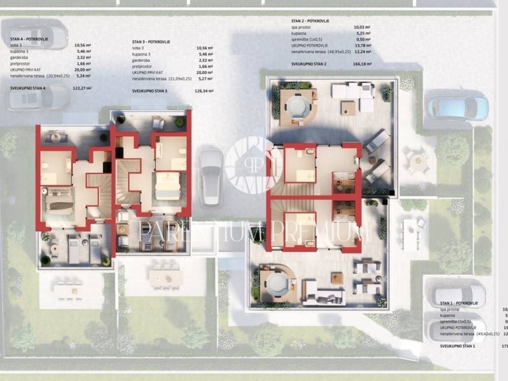 U potkrovlju se nalazi SPA relax prostor za saunu, kupaonica te velika terasa sa priključkom za Jacuzzi.