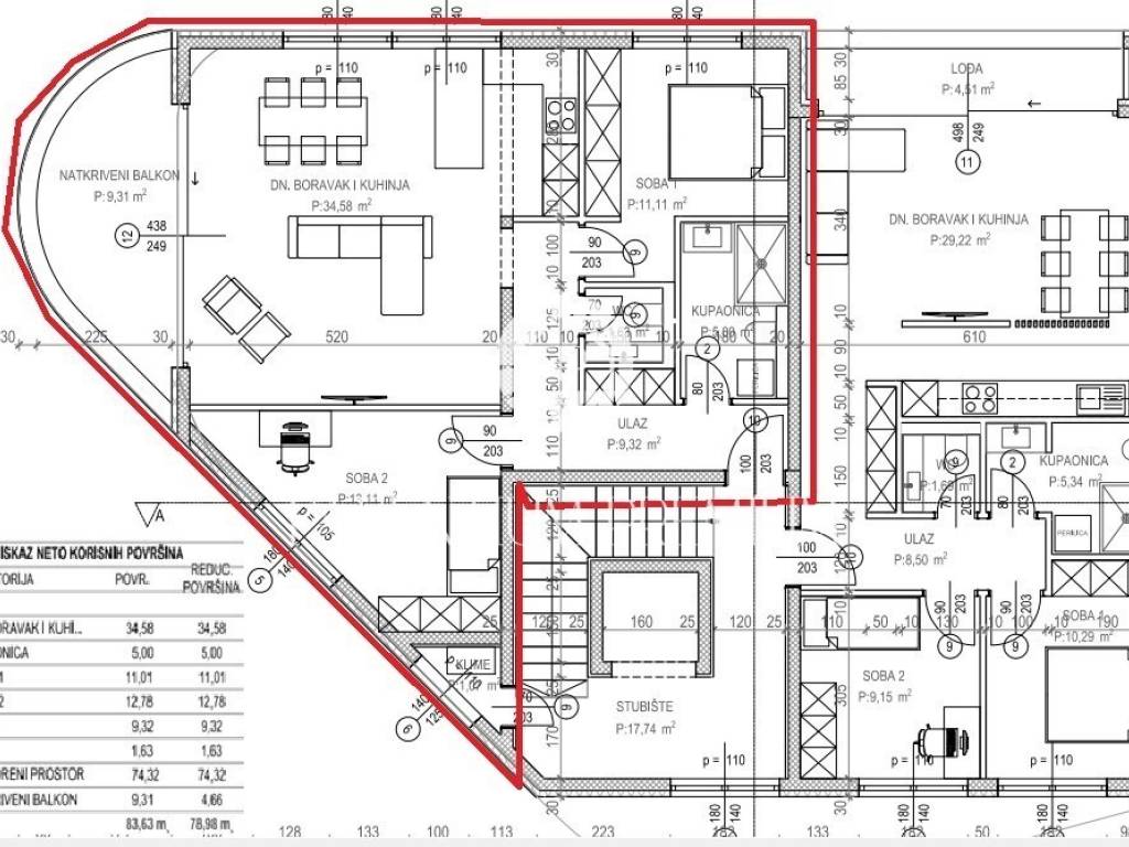 Stan neto površine 78,98 m sastoji se od ulaznog hodnika, dvije spavaće sobe, svijetlog dnevnog boravka s kuhinjom i blagovaonicom, kupaonice, dodatnog WC-a te natkrivene terase od 9,31 m, s koje se pruža predivan panoramski pogled na more.