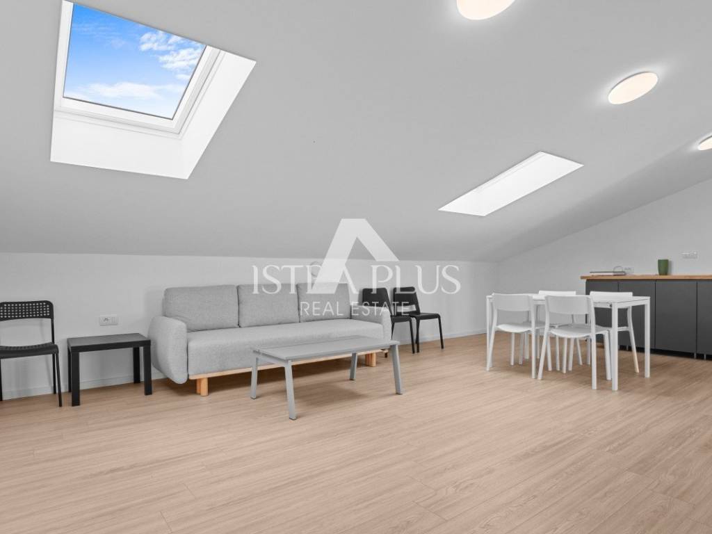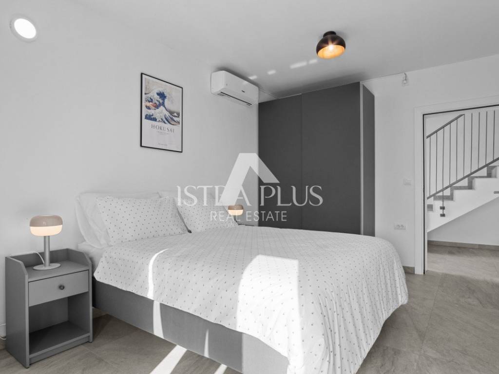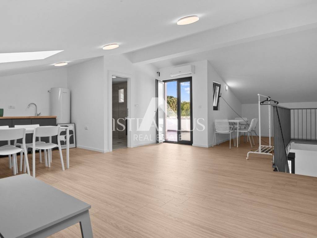 Na drugoj etaži, odnosno u visokom potkrovlju, smješten je dodatni dnevni prostor s kuhinjom i kupaonicom. Ovaj dio može služiti kao zasebna stambena jedinica, radni prostor ili dodatna spavaća soba. Izlaz vodi na prostranu terasu s djelomičnim pogledom na more.