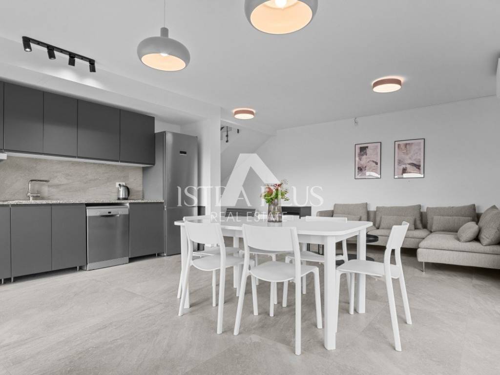 Grijanje i hlađenje riješeni su putem klima uređaja u svim prostorijama, dok su dodatno ugrađeni NOBØ zidni radijatori. Kuhinja je opremljena kvalitetnim Bosch aparatima, a kuća se prodaje potpuno namještena modernim i funkcionalnim namještajem, spremna za useljenje bez dodatnih ulaganja.