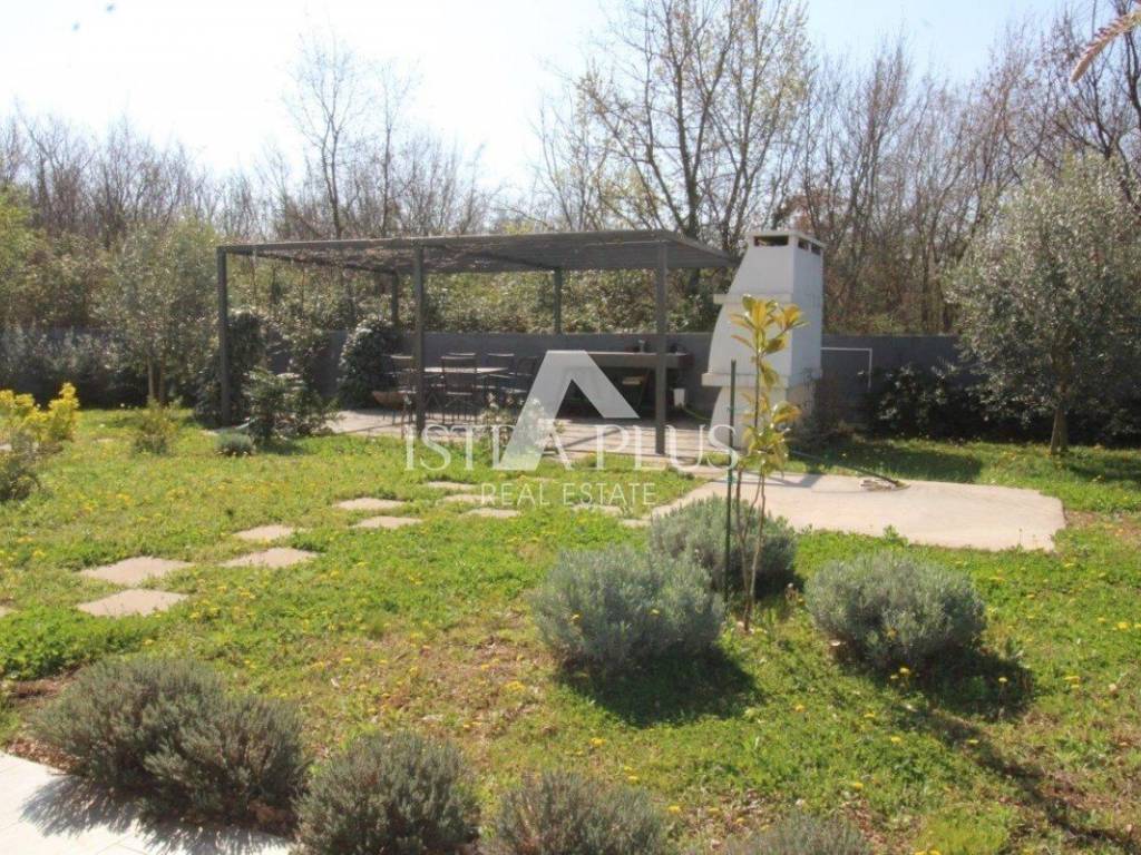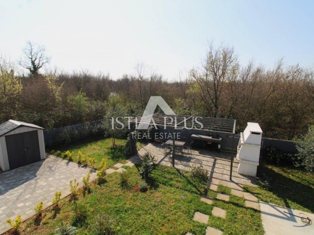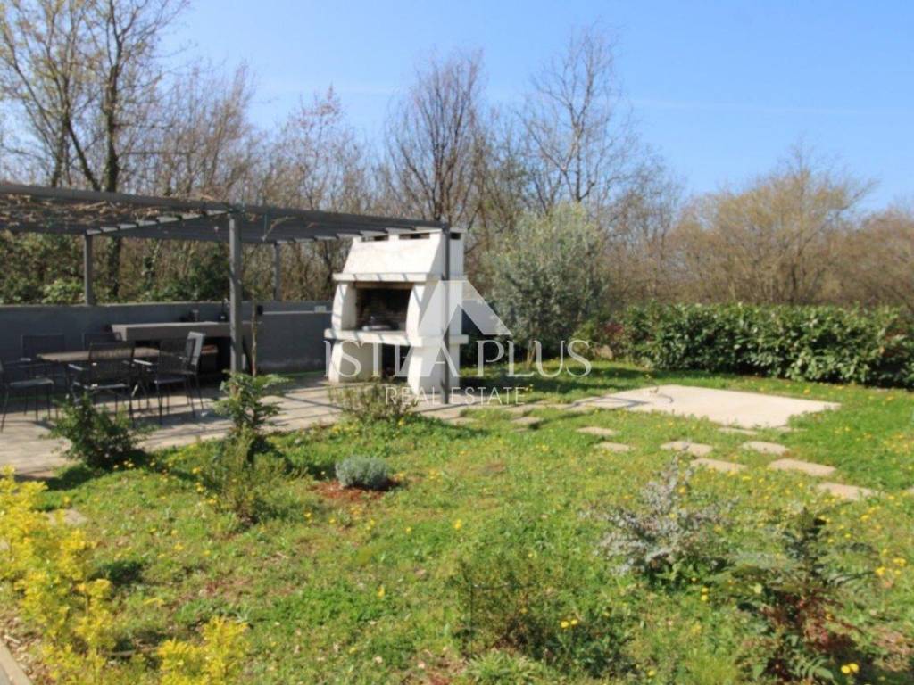 Okućnica je uređena za uživanje i druženje te uključuje kamin, ljetnu kuhinju s blagovaonskim stolom, vrtnu kućicu te pripremljene priključke za jacuzzi.