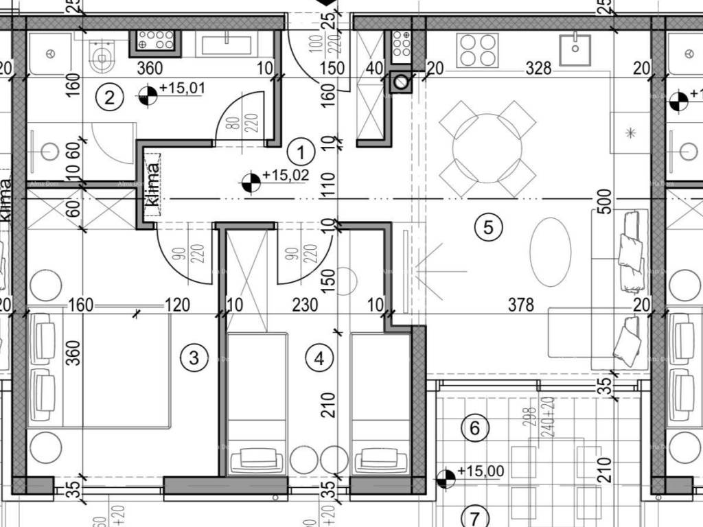 OPREMA: -el.podno grijanje u kupaonici -el.bojler Ariston Velis -protuprovalna ulazna vrata -inverter klima uređaj -keramika -laminat -unutarnja bijela sobna vrata