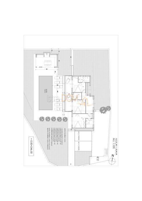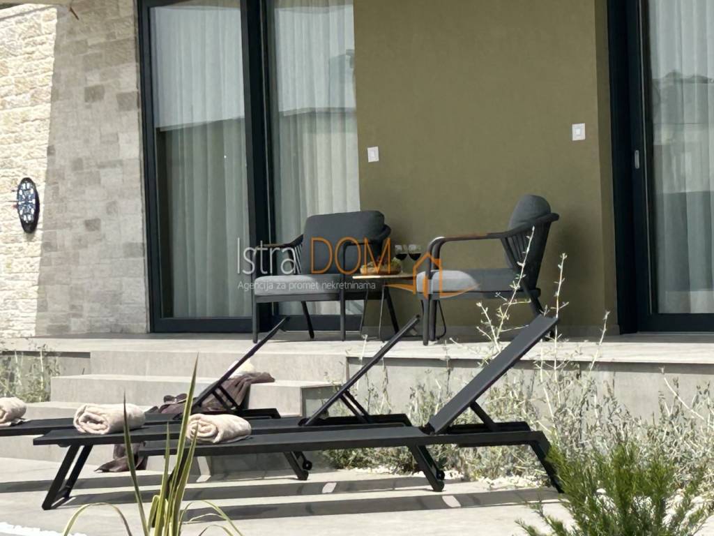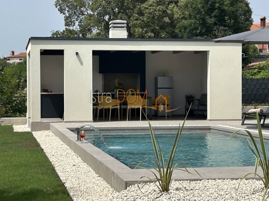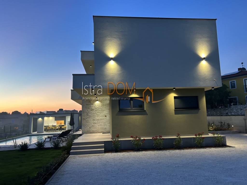 Vila se sastoji od prostranog dnevnog boravka s kuhinjom i blagovaonicom, toaleta, spremišta, kotlovnice i natkrivene terase te pomočnog objekta sa kaminom u prizemlju. Na katu su tri spavaće sobe s kupaonicama i balkonom. U kući ce biti izvedeno grijanje i hlađenje inverterskim klima uređajima, PVC stolarija, keramičke pločice, parket u sobama, pločice u bazenu. Prva faza podnog centralnog grijanja i kolektora. U dvorištu bazen površine 40 m2, travnjak sa automatskim navodnjavanjem, parkiralište za dva automobila, ulazna dvorišna vrata sa automatskim otvaranjem, ogradni zid.