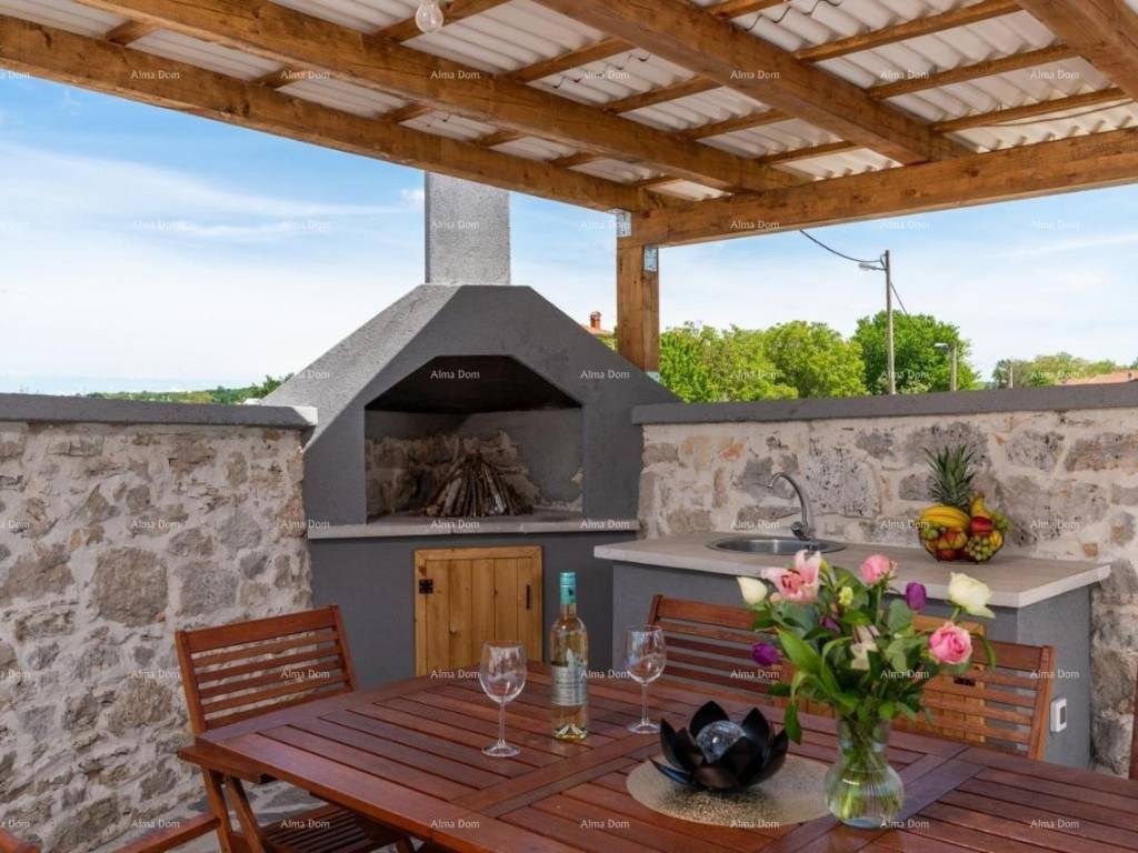 Kuća uključuje dnevni boravak sa kuhinjom i blagavaonom, 3 spavaće sobe, 3 kupaone, vešeraj, terasu koja ima vanjsku jedinicu za ručavanje (ljetnna kuhinja i roštilj) i vrt na kojem se nalazi bazen.