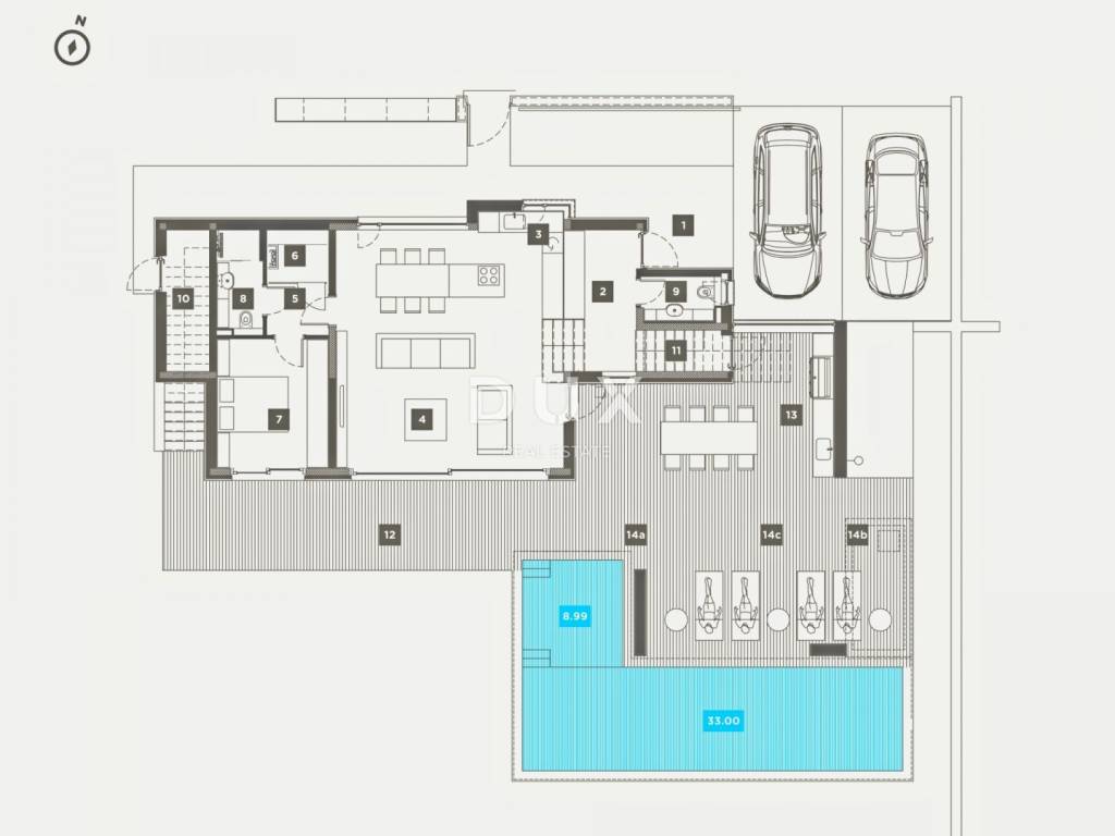 Kuća suvremenog iskoraka u bezvremenskoj arhitekturi s naglaskom na funkcionalnost i estetiku se oblikovno i koloristički uklopa u naselje i krajolik, razvedena je na dvije etaže funkcionalnog tlocrta a stambena površina nudi skladan životni ambijent okupan prirodnom svjetlošću koji odiše sofisticiranošću i udobnošću.