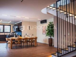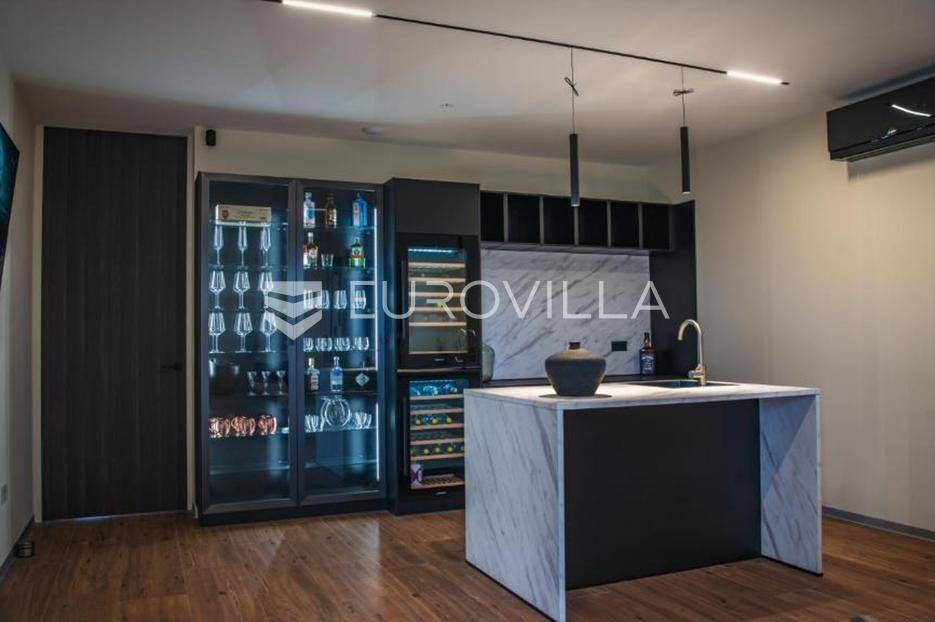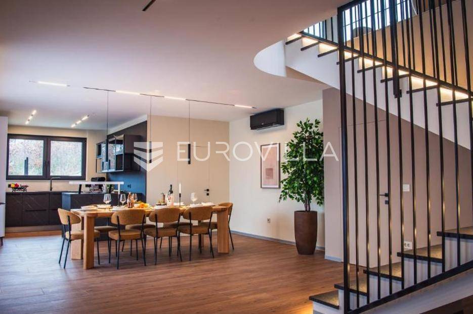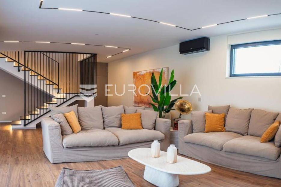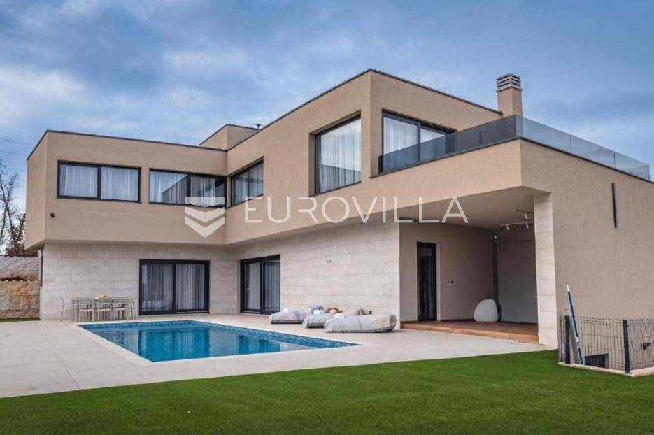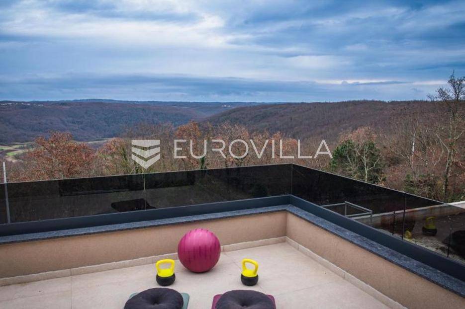 U mirnom i zelenom dijelu središnje Istre, na uređenoj parceli od 780 m², smjestila se suvremena luksuzna kuća koja savršeno spaja privatnost, eleganciju i ugodan stil života. Okružena prirodom, pruža osjećaj potpune izoliranosti, a istovremeno oduševljava otvorenim panoramskim pogledom koji se proteže sve do Učke i dodatno naglašava njezinu jedinstvenu poziciju.Prostor je osmišljen tako da dnevni boravak, kuhinja izrađena po mjeri i blagovaonica čine skladnu cjelinu koja se nastavlja na vanjske terase i zone za opuštanje. Velike staklene stijene propuštaju obilje prirodnog svjetla i uokviruju pogled na okolni krajolik, brišući granicu između interijera i eksterijera te stvarajući poseban osjećaj prostranosti i povezanosti s prirodom.Kuća raspolaže s četiri prostrane spavaće sobe, svaka s vlastitom kupaonicom, čime je osigurana potpuna privatnost i udobnost za sve korisnike. Glavna spavaća soba ima i vlastiti balkon s kojeg se pruža očaravajući panoramski pogled na Učku, idealan za uživanje u mirnim jutrima ili zalascima sunca.Poseban naglasak stavljen je na uživanje i opuštanje – tu je i prostor predviđen za masažu te vinoteka koja stvara intimnu atmosferu za druženja i večeri uz vino. Dvije dodatne ostave diskretno su uklopljene u raspored, pružajući praktičnost bez narušavanja estetike prostora.Vanjski dio kuće zamišljen je kao prava privatna oaza. Grijani bazen površine 50 m² okružen je prostranom grijanom sunčališnom zonom, iz koje se također pruža otvoren pogled na prirodu, što omogućuje boravak na otvorenom i izvan ljetne sezone. Uređeni lounge prostor i vanjski roštilj dodatno upotpunjuju doživljaj boravka na svježem zraku.Nekretnina je opremljena podnim grijanjem, dizalicama topline i klimatizacijom u svim prostorijama, a izgrađena je prema visokim energetskim standardima. U donjoj etaži nalazi se dodatni prostor za tehničke potrebe ili skladištenje, što dodatno povećava funkcionalnost.Postoji i mogućnost kupnje susjedne parcele od istog vlasnika, čime se otvara prilika za dodatno proširenje ili osiguravanje još veće privatnosti, što ovu ponudu čini posebno atraktivnom na tržištu.Ova nekretnina predstavlja izvrsnu priliku kako za miran obiteljski život, tako i kao investicija u luksuzni turistički najam.Za više informacija ili dogovor oko razgledavanja, slobodno me kontaktirajte.... Više na eurovilla.hr, ID: 572735