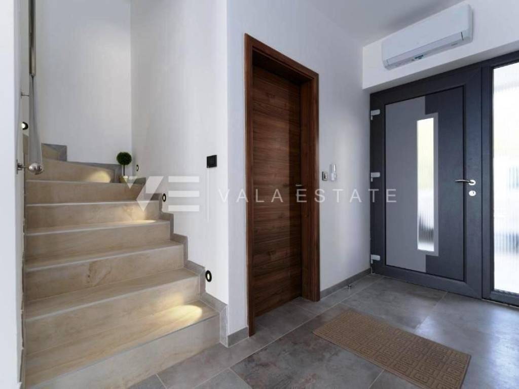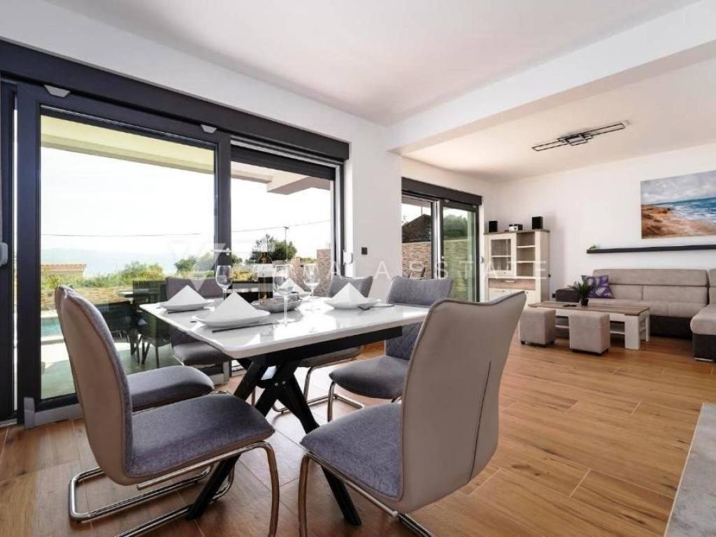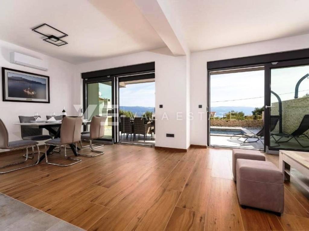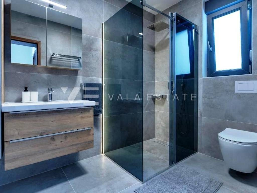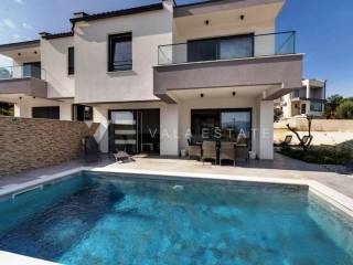 Nekretnine otok Krk, Vrbnik okolica - na prodaju je moderna kuća sa dva odvojena dvoetažna apartmana smještena na lijepoj i mirnoj lokaciji u blizini mora i centra. Ukupna stambena površina kuće od 300 m2 . Svaki apartman raspoređen je na prizemlje u kojem se nalazi ulazni prostor, strojarnica, toalet, prostrani dnevni boravak i kuhinja sa blagovaonom, te kata gdje su smještene tri spavaće sobe, garderoba, dvije kupaonice i terase sa panoramskim pogledom na more. Apartmani imaju uređene terase u prizemlju i na katu, s mogućnošću izlaza iz spavaćih soba. Za gradnju su se koristili kvalitetni materijali i oprema koji uključuju podne obloge od keramike, kvalitetne sanitarije, podno grijanje, Fan-coil multi split klimatizaciju prostorija, ugrađenu visokokvalitetnu PVC stolariju te protuprovalna vrata. Potpuno su namješteni i opremljeni novim modernim namještajem po mjeri i kao takvi se i prodaju. Na lijepo uređenoj i ograđenoj okućnici koja pruža privatnost nalaze se natkrivene terase, bazeni sa sunčalištem, ljetne kuhinje i prostor za četiri parkirna mjesta. Posebna vrijednost ove nekretnine je što ima trajni panoramski pogled iz prizemlja i sa kata. Smještena je na mirnoj lokaciji dovoljno daleko od gradske buke i vreve, no opet u blizini plaže i centra mjesta sa svim potrebnim sadržajima. Odlična je za vlastito korištenje ali i dobra prilika za investiciju u svrhe turističkog najma.