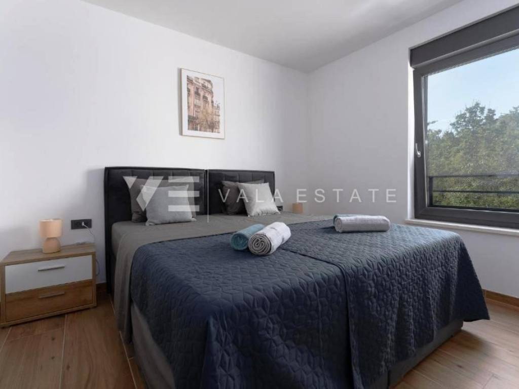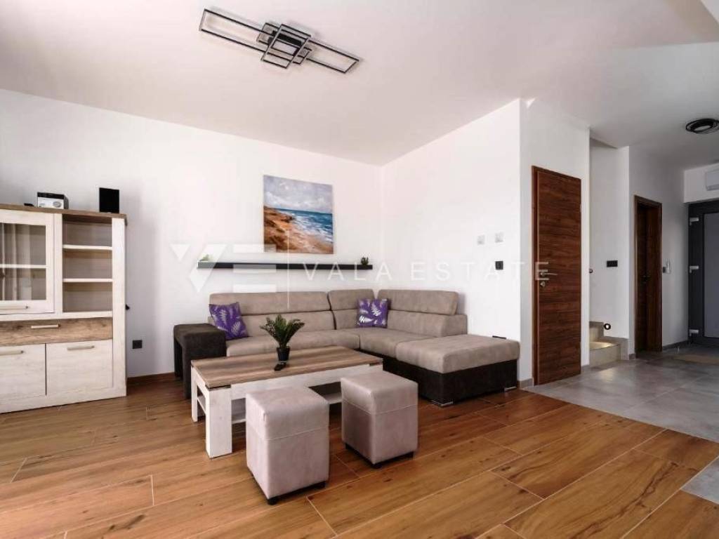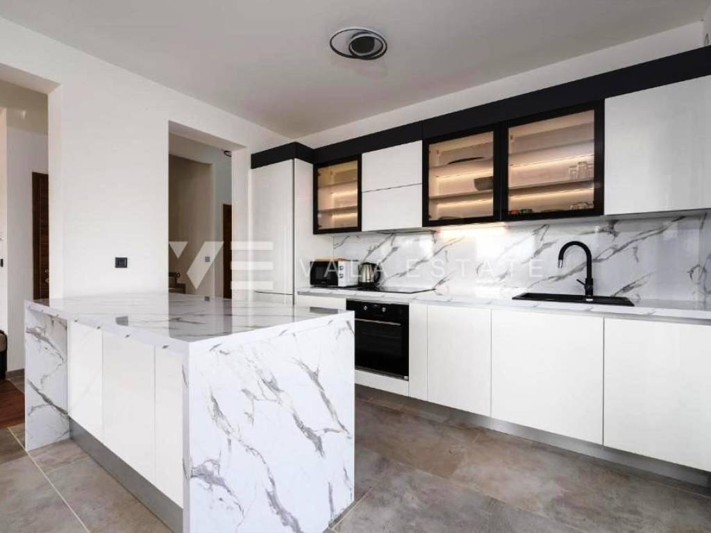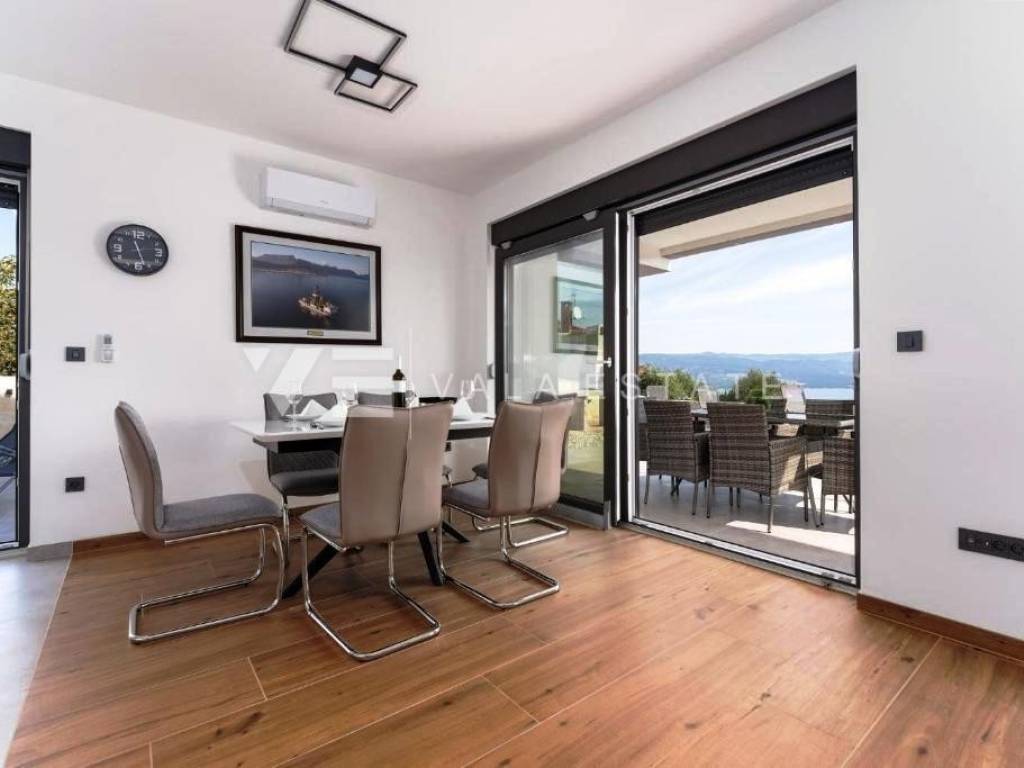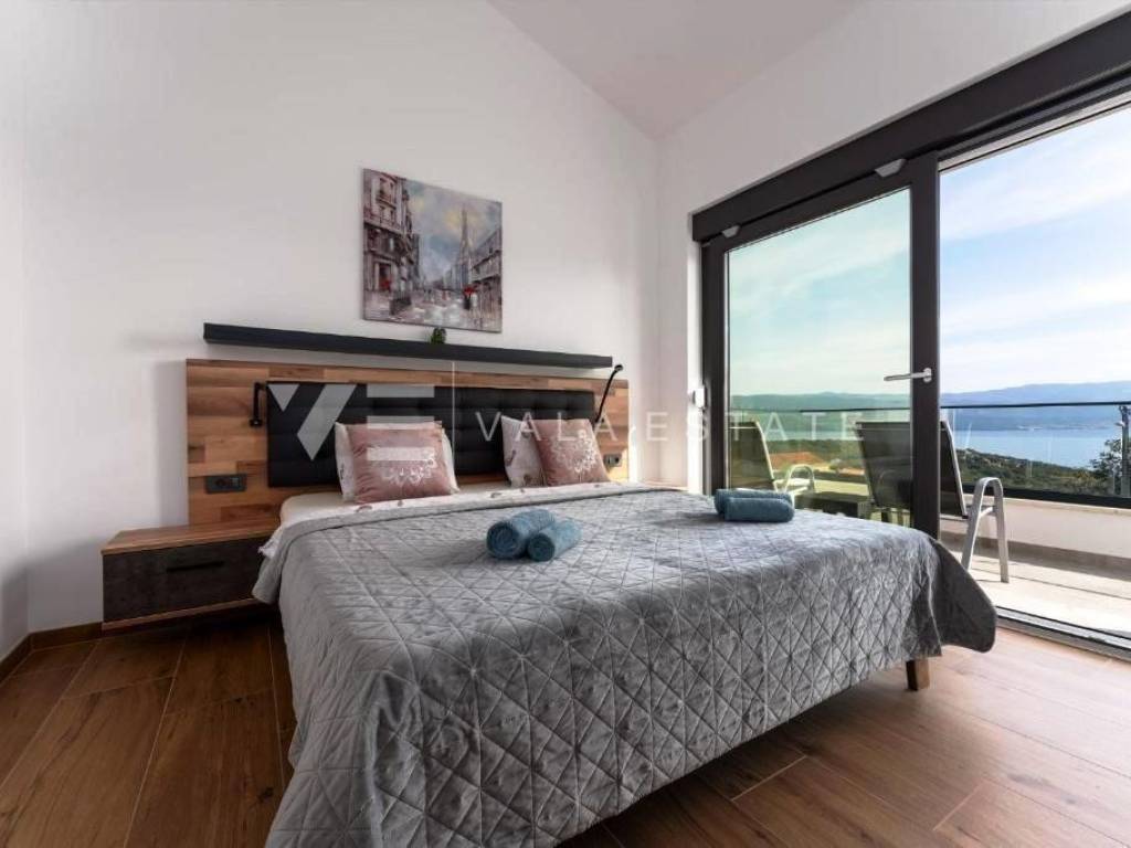 Nekretnine otok Krk, Vrbnik okolica - na prodaju je moderna kuća sa dva odvojena dvoetažna apartmana smještena na lijepoj i mirnoj lokaciji u blizini mora i centra. Ukupna stambena površina kuće od 300 m2 . Svaki apartman raspoređen je na prizemlje u kojem se nalazi ulazni prostor, strojarnica, toalet, prostrani dnevni boravak i kuhinja sa blagovaonom, te kata gdje su smještene tri spavaće sobe, garderoba, dvije kupaonice i terase sa panoramskim pogledom na more. Apartmani imaju uređene terase u prizemlju i na katu, s mogućnošću izlaza iz spavaćih soba. Za gradnju su se koristili kvalitetni materijali i oprema koji uključuju podne obloge od keramike, kvalitetne sanitarije, podno grijanje, Fan-coil multi split klimatizaciju prostorija, ugrađenu visokokvalitetnu PVC stolariju te protuprovalna vrata. Potpuno su namješteni i opremljeni novim modernim namještajem po mjeri i kao takvi se i prodaju. Na lijepo uređenoj i ograđenoj okućnici koja pruža privatnost nalaze se natkrivene terase, bazeni sa sunčalištem, ljetne kuhinje i prostor za četiri parkirna mjesta. Posebna vrijednost ove nekretnine je što ima trajni panoramski pogled iz prizemlja i sa kata. Smještena je na mirnoj lokaciji dovoljno daleko od gradske buke i vreve, no opet u blizini plaže i centra mjesta sa svim potrebnim sadržajima. Odlična je za vlastito korištenje ali i dobra prilika za investiciju u svrhe turističkog najma.