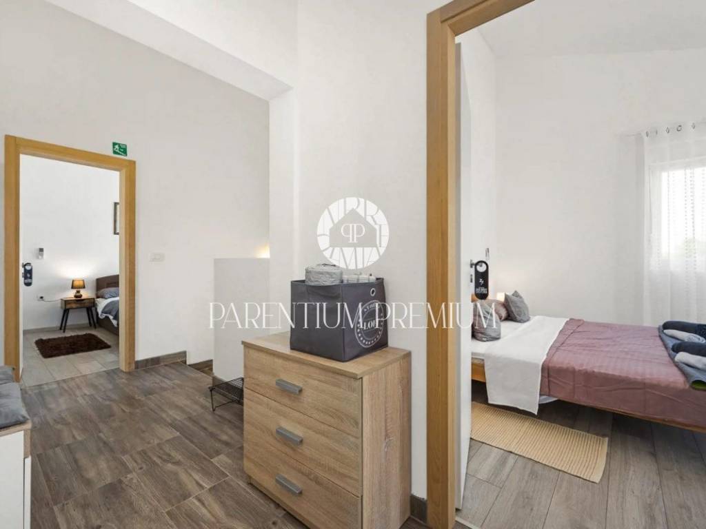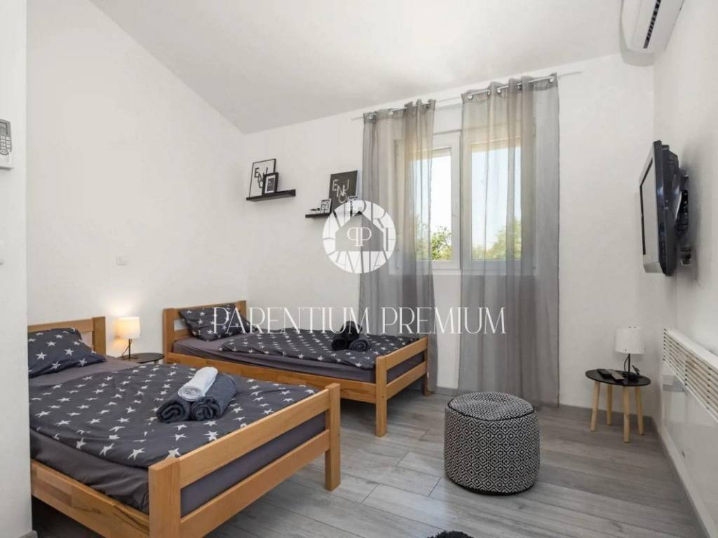 Kuća je ukupne površine od 170m2 i sastoji se od otvorenog dnevnog boravka u kojemu se nalazi opremljena kuhinja i blagovaona sa izlazima na terasu i dvorište te bazen i sunčalište koji se nalazi na toj strani kuće. u prizemlju imamo još jednu spavaću sobu i kupatilo. Na katu kuće su smještene 3 spavaće sobe od kojih 1 ima vlastito kupatilo te izlaz na terasu uz još jednu dodatnu kupaonu u hodniku.