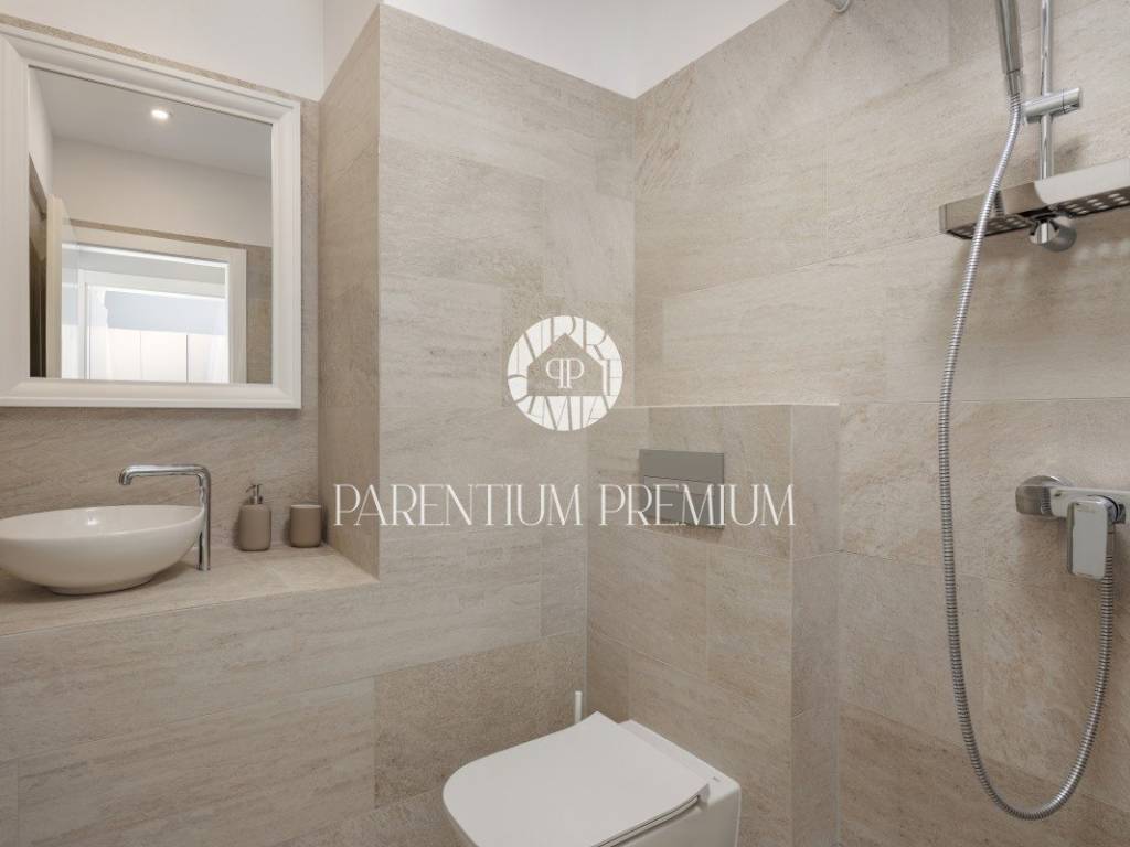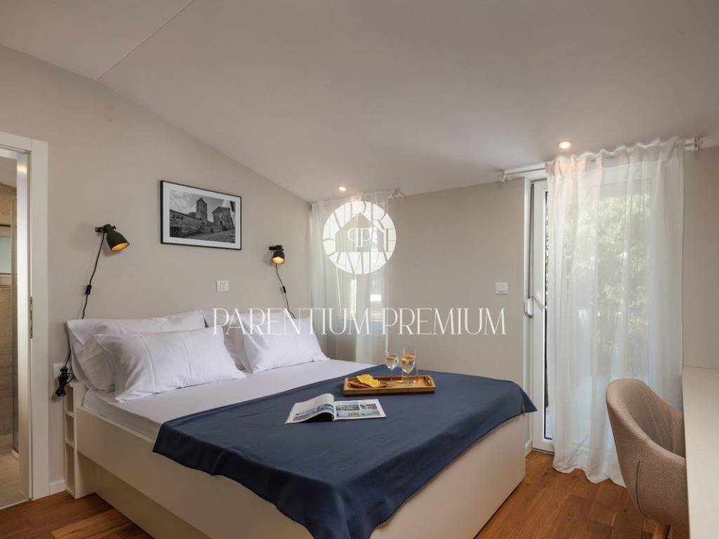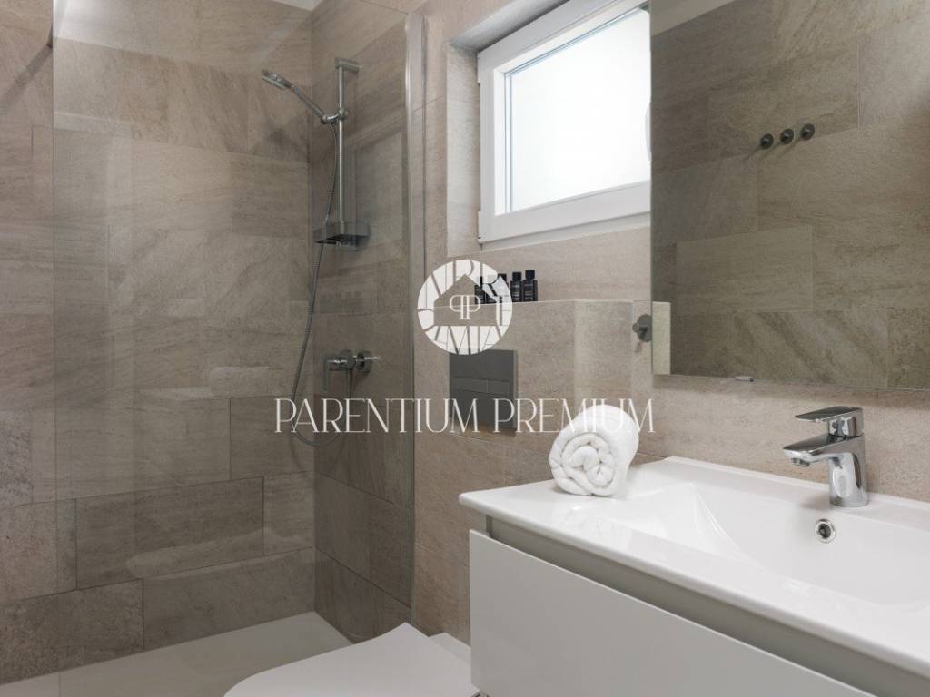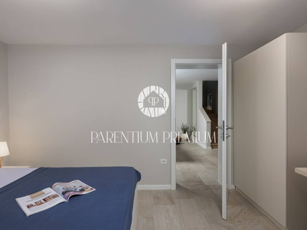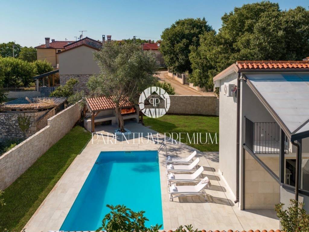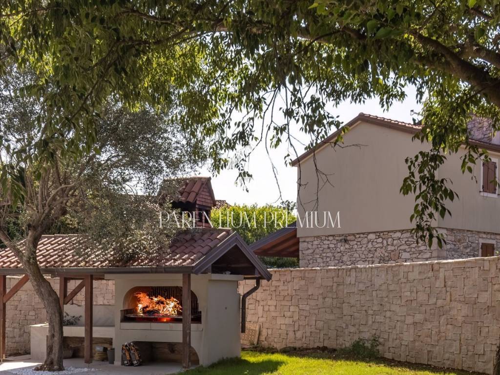 Ova kuća prostire se na ukupnoj površini od 165 m2 i proteže se na dvije etaže. U prizemlju vas dočekuje prostrani dnevni boravak s moderno opremljenom kuhinjom i elegantnom blagovaonicom. Tu je i jedna udobna spavaća soba, luksuzna kupaonica, dodatni WC i praktična ostava. Iz dnevnog boravka, korakom prema van, ulazite na čarobnu natkrivenu terasu koja poziva na opuštanje i uživanje u svježem zraku. Terasa vodi do ljetne kuhinje s kaminom, grijanog bazena s protustrujnim plivanjem i prostranog sunčališta, okruženog prekrasno uređenim vrtom.