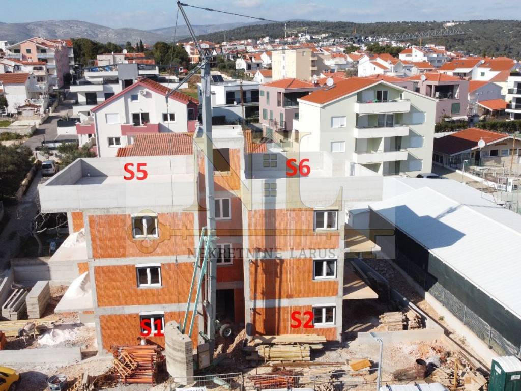 Posredujemo u prodaji penthouse stana S5 sa krovnom terasom na drugom katu novogradnje u Okrugu Gornjem, otok Čiovo. Zgrada je južne orijentacije u slijepoj ulici na mirnoj lokaciji s pogledom na otoke Brač i Šoltu, nekih 300 metara od mora i plaže. Penthouse stan S5 sa krovnom terasom na drugom katu se sastoji se od predsoblja, dvije spavaće sobe, kuhinje s dnevnim boravkom i blagovaonicom, kupaonice i balkona te krovne terase. Stan ima protuprovalna vrata, klima uređaj i podno grijanje u kupaonici i dnevnom boravku. Stanu pripada jedno vanjsko parking mjesto. Površine: Unutrašnji dio stana + balkon: 54,16 m2 Krovna terasa: 56,96 m2 Gradnja je započela u siječnju 2024., te se predviđa završetak početkom 2025.