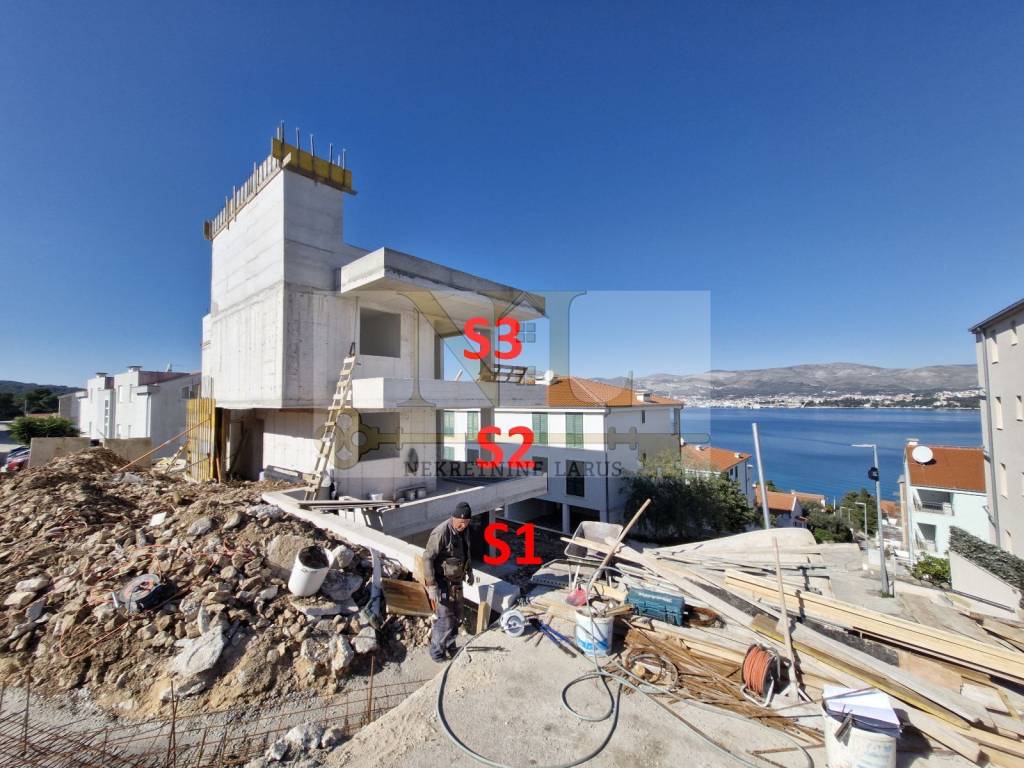 Prodajemo penthouse stan S3 na drugom katu sa krovnom terasom, Okrug Gornji, otok Čiovo. Zgarada se sastoji od 3 stana i svakom stanu pripadaju po dva vanjska parkirališna mjesta. Udaljenost zgrade od mora i plaže je 160 m. Penthouse stan S3 na drugom katu sa krovnom terasom sastoji se od: tri spavaće sobe, dvije kupaonice, hodnik, prostrani dnevni boravak s kuhinjom i blagovaonicom, predsoblja i balkona te pripadajuće krovne terase. Površine: - Unutrašnji dio stana: 80,26 m2 - Terasa: 13,98 m2 - Krovna terasa: 82 m2 Ukupna podna površina stana: 176,24 m2 Planirani završetak radova je u srpanj 2025. godine.