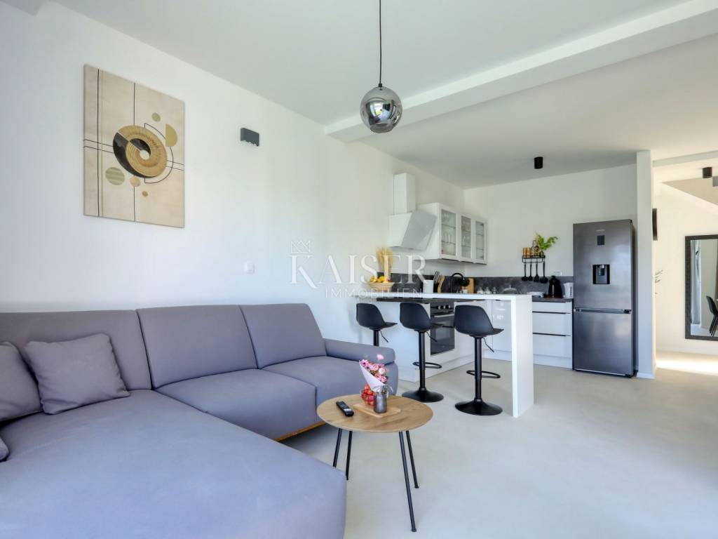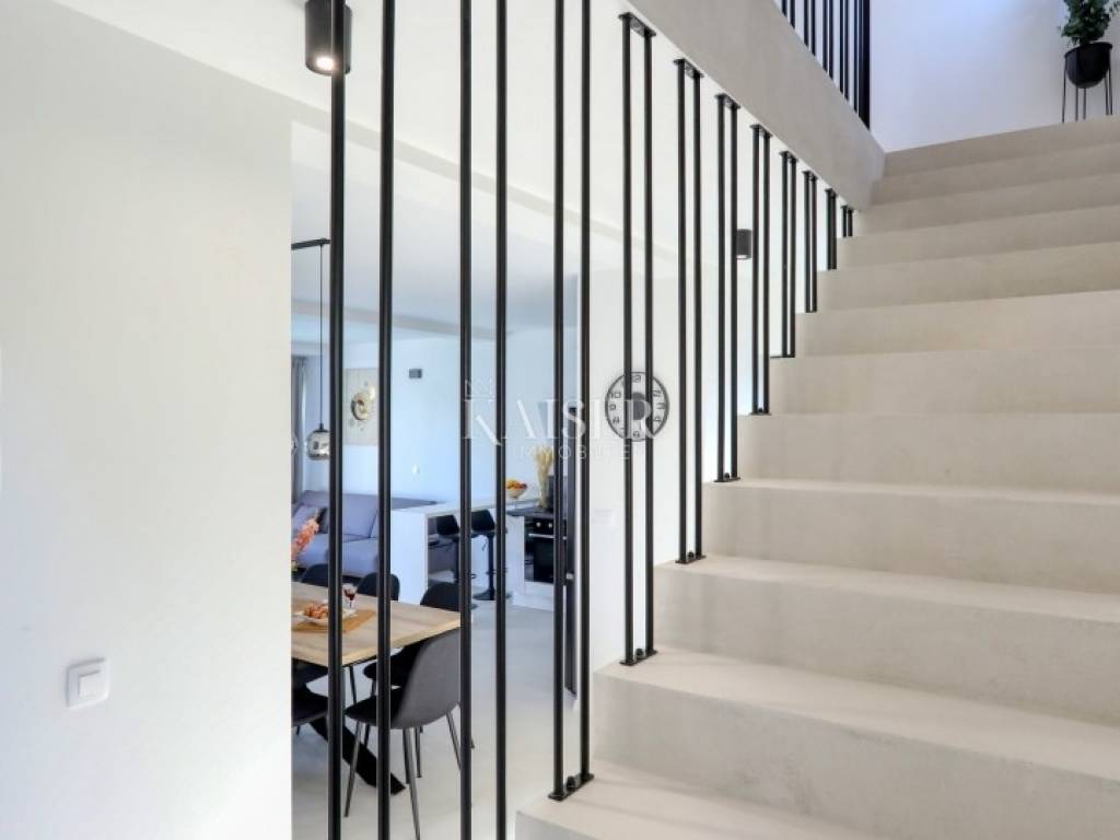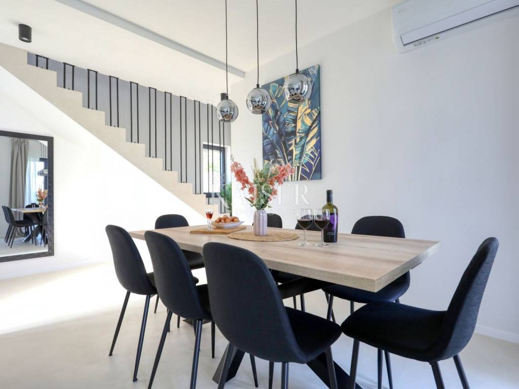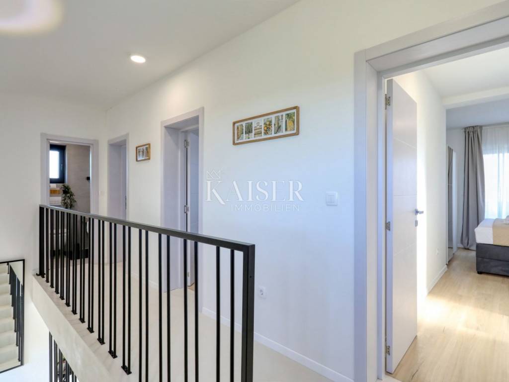 Kuća ukupne stambene površine 137 m2 izgrađena je na parceli od 501 m2. Sastoji se od prizemlja i kata. U prizemlju se nalazi prostrani dnevni boravak, kuhinja, blagovaonica, jedna spavaća soba i kupaonica. Na katu se nalaze tri spavaće sobe i dvije kupaonice od čega jedna soba ima vlastitu kupaonicu. U prostranom dvorištu nalazi se grijani bazen, sunčalište, igralište za djecu i ljetna kuhinja te privatni parking. Kuća je kompletno klimatizirana a u kupaonicama je provedeno podno grijanje.