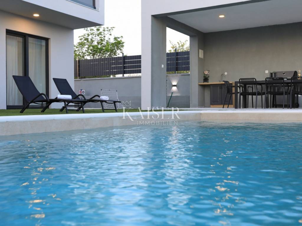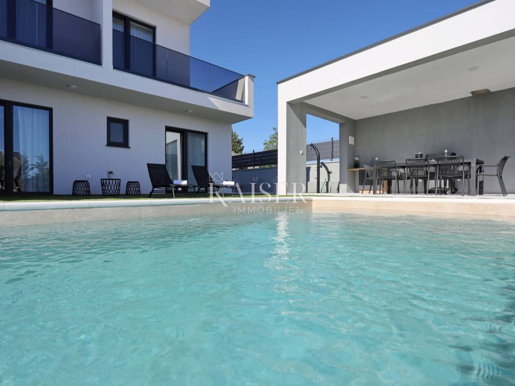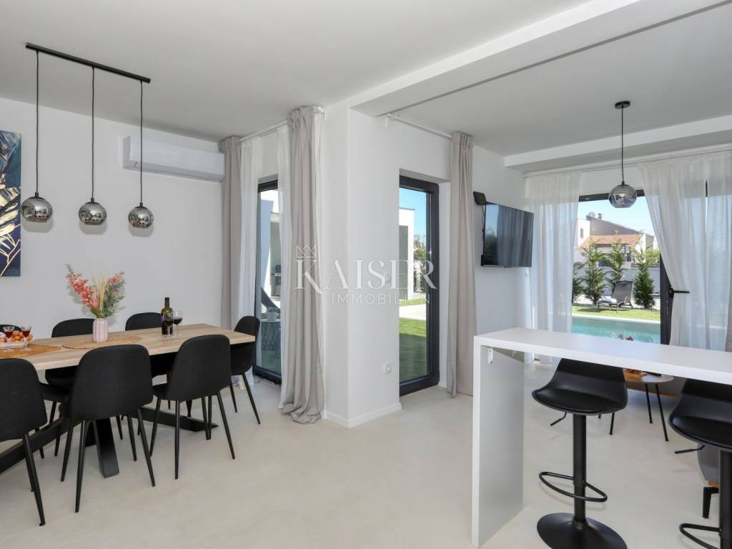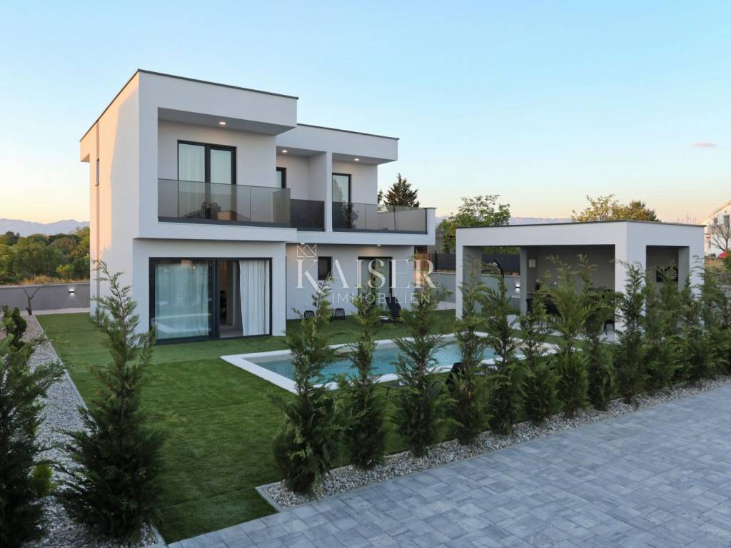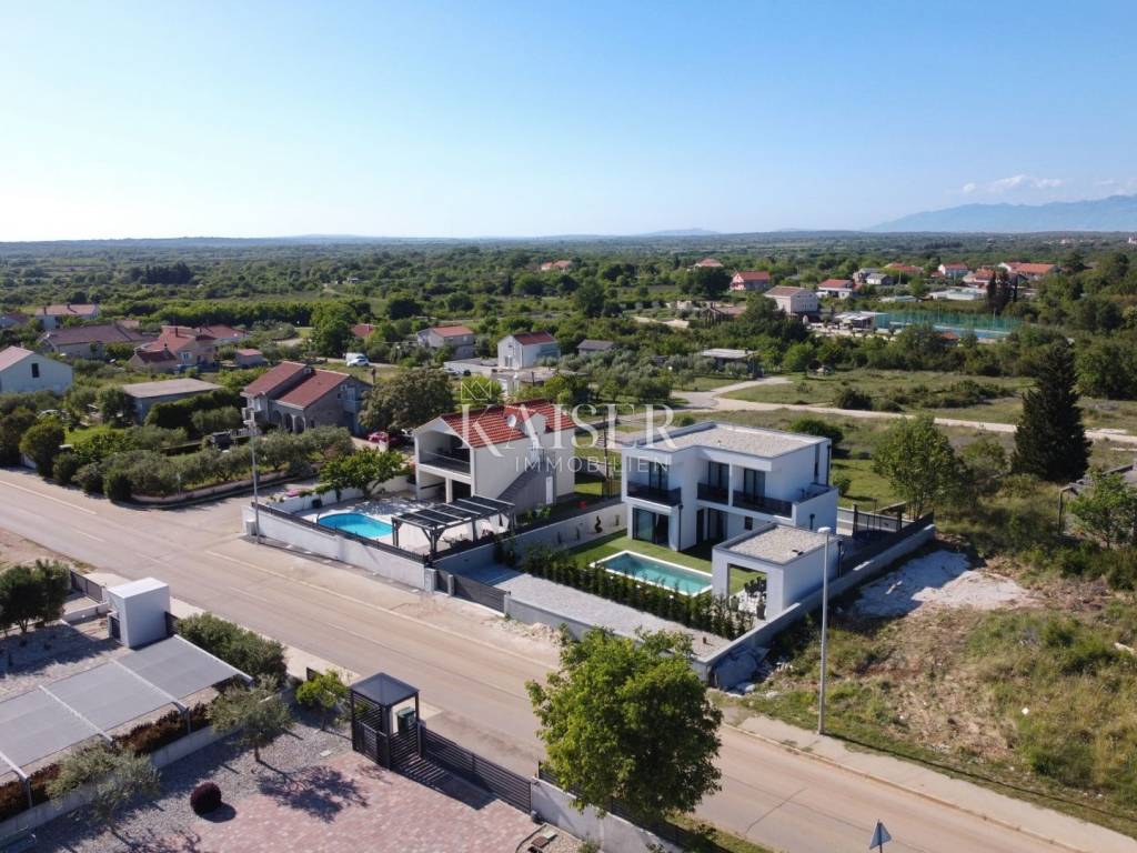 Kaiser Immobilien predstavlja vam ovu modernu vilu koja se nalazi u srcu mirnog naselja Poljica Brig, samo nekoliko kilometara od povijesnog Zadra , kao i nekoliko minuta od kraljevskog grada Nina i predivnih plaža. Grad Nin nekoć je u povijesti bio poznat i kao kraljevski grad, a u Ninu se nalazi i 8 km duga pješčana plaža, te lokalitet s ljekovitim blatom. U blizini je dostupno mnoštvo zanimljivog sadržaja poput brojnih Nacionalnih parkova i Parkova prirode, kao i prekrasnih otoka zadarskog akvatorija. Najbliže urbano središte, grad Zadar udaljeno je 10 km, a najbliža zračna luka Zemunik pokraj Zadra udaljena je 18 km. Projektirana s naglaskom na eleganciju i funkcionalnost, ova nekretnina predstavlja kombinaciju luksuza i praktičnosti, nudeći idealan prostor za život, odmor ili investiciju u turistički najam s obzirom da već ima uhodano turističko poslovanje.