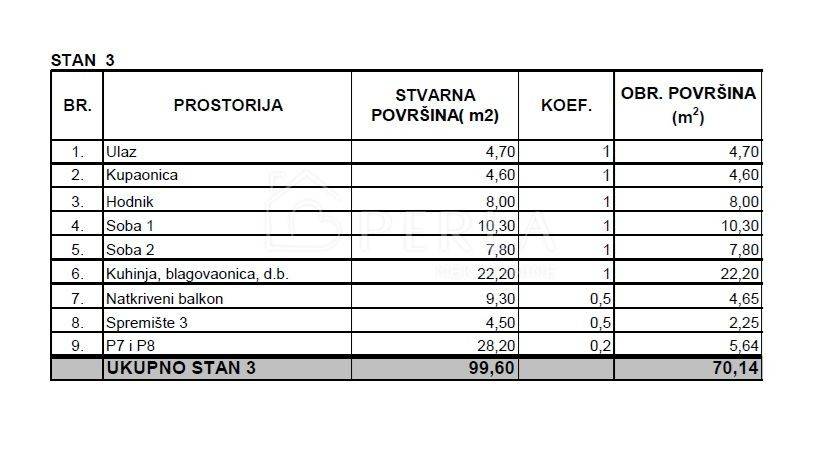 Ukupna površina stana sa sporednim dijelovima i pripadcima iznosi 99,60 m2, a ukupna neto korisna vrijednost površine iznosi 70,14 m2 .