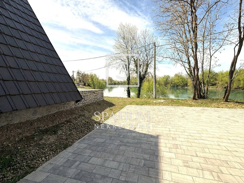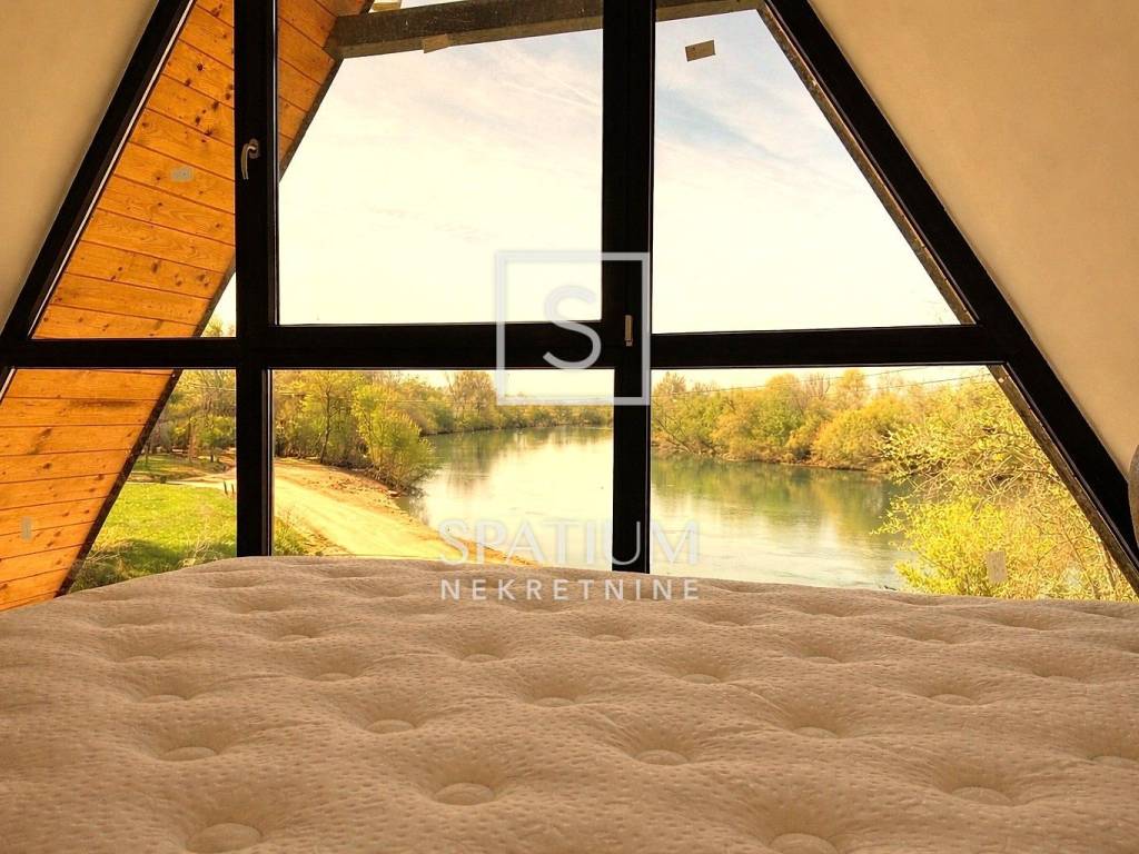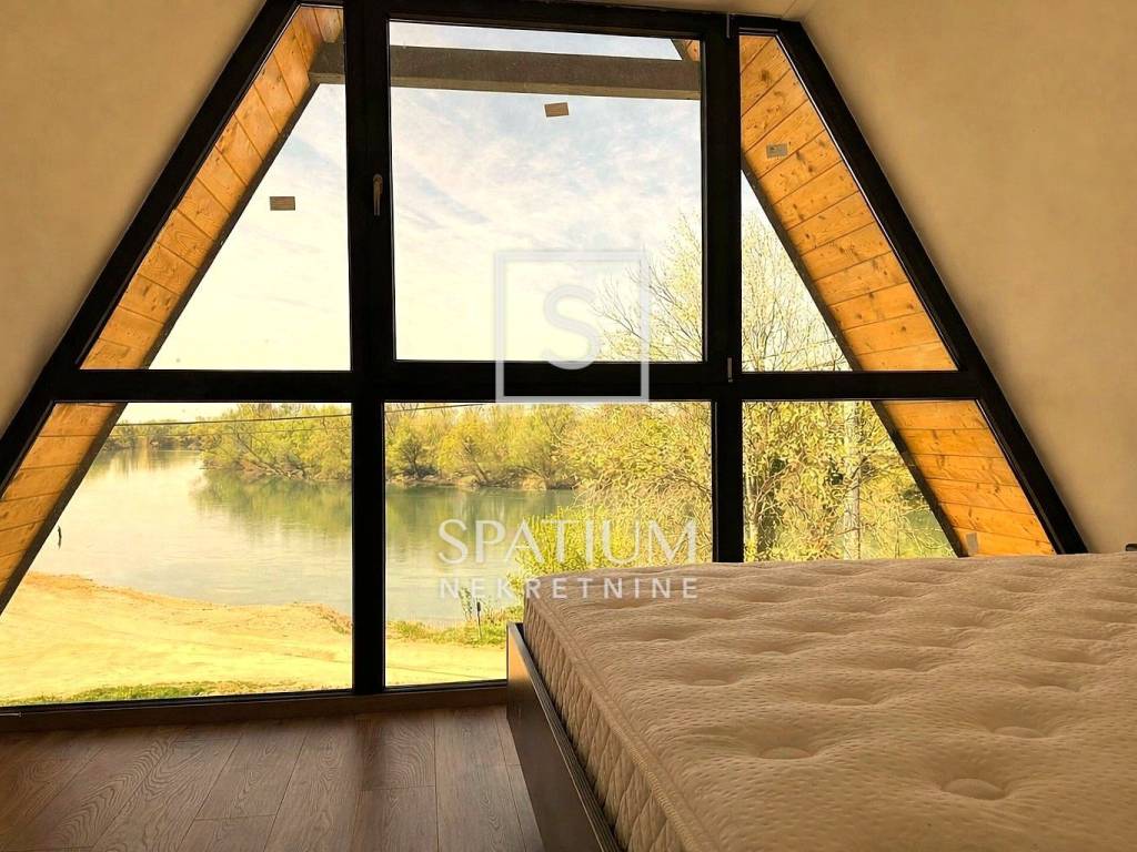 KARLOVAC - OKOLICA, u ponudu smo dobili predivnu novosagrađenu A-Frame kuću ukupne površine 120 m2, smještenu na idiličnoj lokaciji, svega 10 metara od rijeke Kupe. Sastoji se od prizemlja u kojem se nalazi velika kupaonica, tehnička prostorija te prostrani otvoreni prostor s kuhinjom, blagovaonom i dnevnim boravkom koji ima izlaz na vanjsku terasu s jaccuzziem i direktnim pogledom na rijeku Kupu.