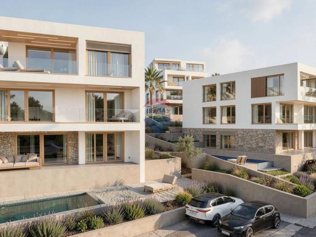 Predmetni stan se nalazi u visokom prizemlju, a sastoji se od: 2 spavaće sobe (master soba ima svoju vlastitu kupaonicu i walk in ormar, dok druga spavaća soba ima svoju vlastitu kupaonicu), dnevnog boravka s kuhinjom i blagovaonom s izlazom na natkrivenu terasu 20,99 m2 s pogledom na more, odvojenog wc-a, praone/tehnike, špajze u sklopu kuhinje i hodnika.