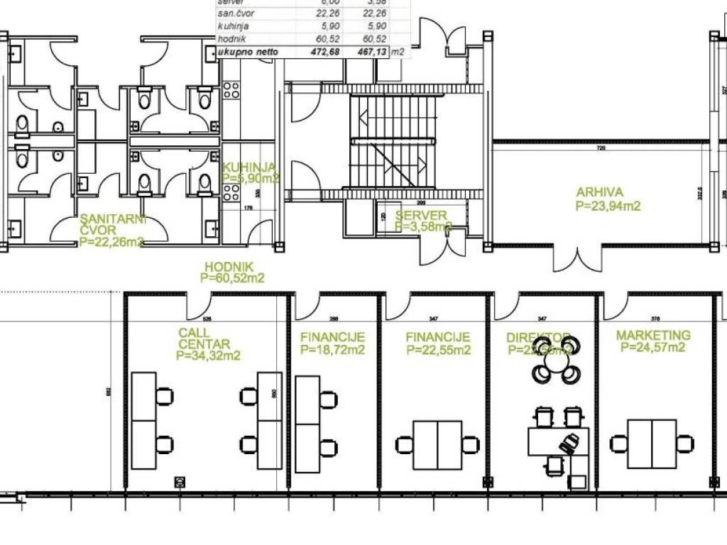 Najam / zakup ureda - Novi Zagreb Standard zgrade uključuje gotovi ured sa duplim podom, tapisonom, spuštenim stropom i ugrađenom rasvjetom, električnom mrežom, utičnicama, IT CAT6 strukturnom mrežom (3 utičnice/radno mjesto), SAT TV instalaciju, 4-cijevni HVAC sistem (grijanje i hlađenje), pomoćni generator i UPS te odvojene toalete. Razmještaj pregradnih zidova se može razmjestiti po želji. Objekt je opremljen protupožarnim i protuprovalnim alarmom, sustavom kontrole pristupa, 24-satnim osiguranjem i video nadzorom. Specifikacija Poslovni prostor na 2. katu se sastoji od 24 većih i manjih ureda. Vlastita kuhinja i toaleti. Parking dostupan na površini i u garaži Prostor se iznajmljuje u viđenom stanju. Pregrađivanje i dodatno uređenje ide na teret zakupnika. - najam 11 €/m2, Zajednički troškovi 5 €/m2 - vanjski parking 50 €, parking u garaži 60€ - Obračun zajedničke potrošnje na kraju godine - Plaća se struju koja se potroši u prostoru i očita na brojilu za prostor (tzv. Ind. potrošnja). Uvjeti suradnje naše tvrtke svode se na jednokratnu naknadu u visini jedne mjesečne neto zakupnine uvećano za PDV u slučaju sklapanja ugovora o zakupu.