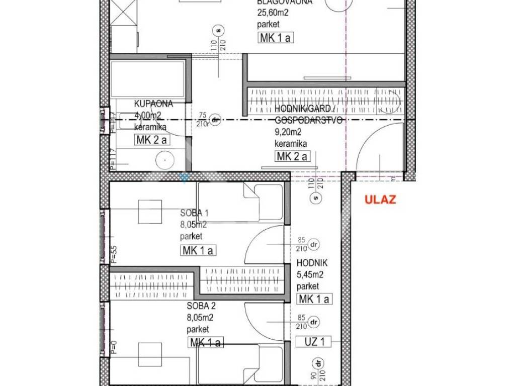 Podovi: parket, a u kupaonicama pločice i sanitarije 1. klase