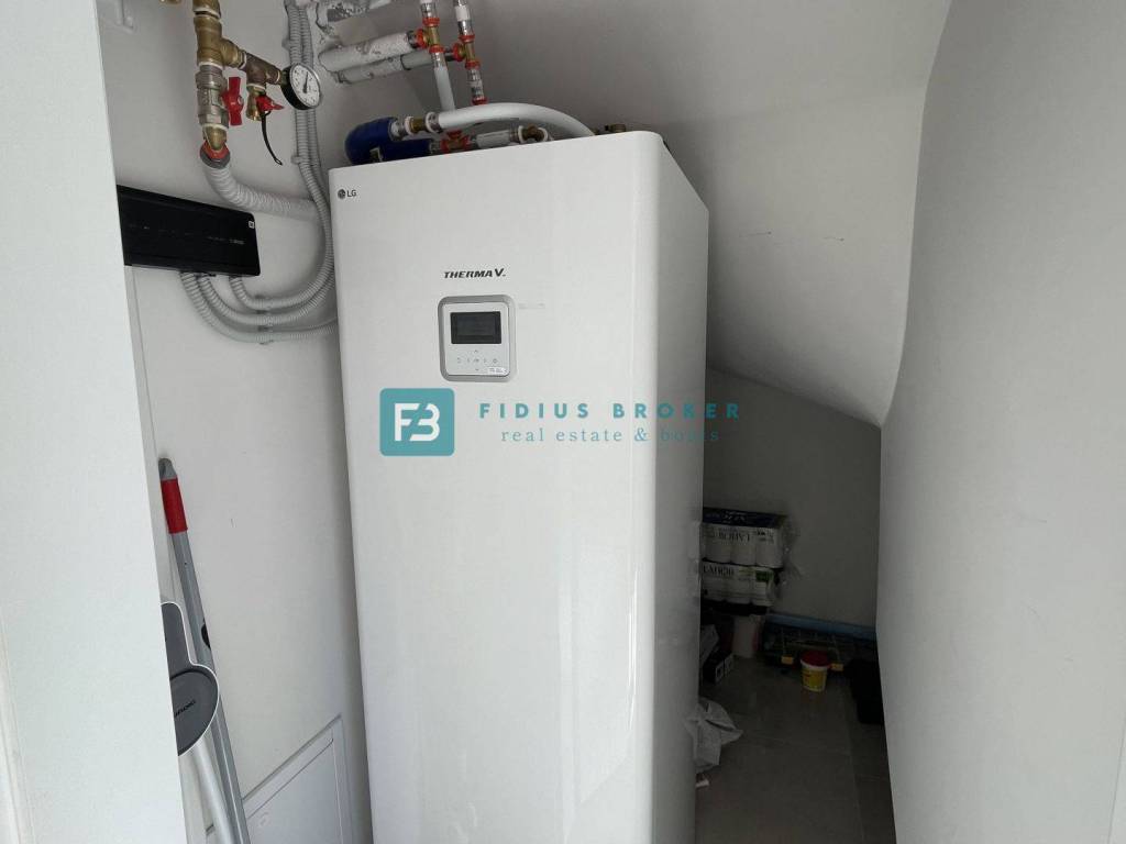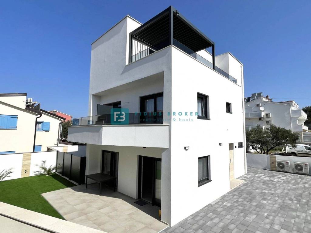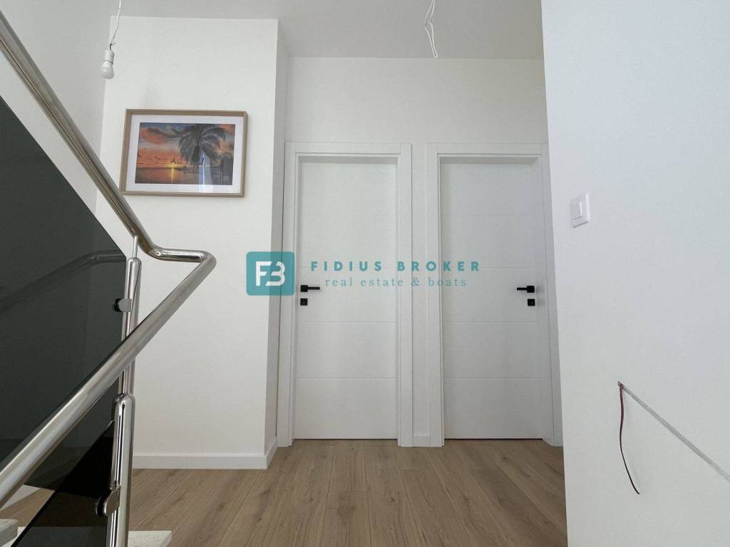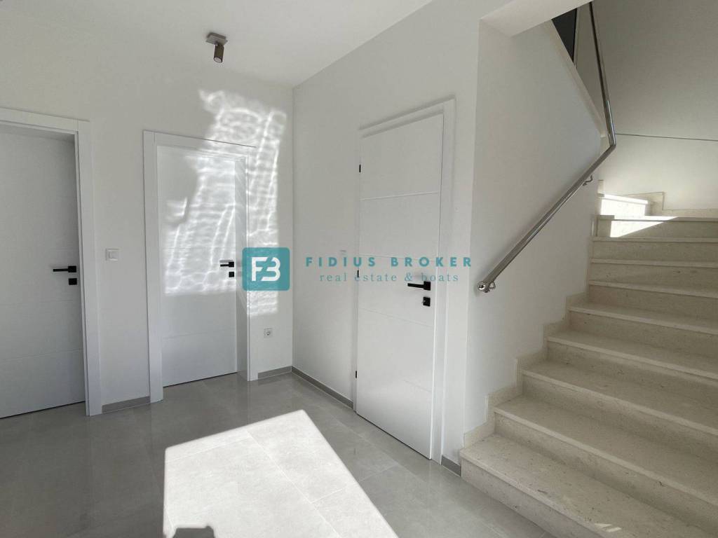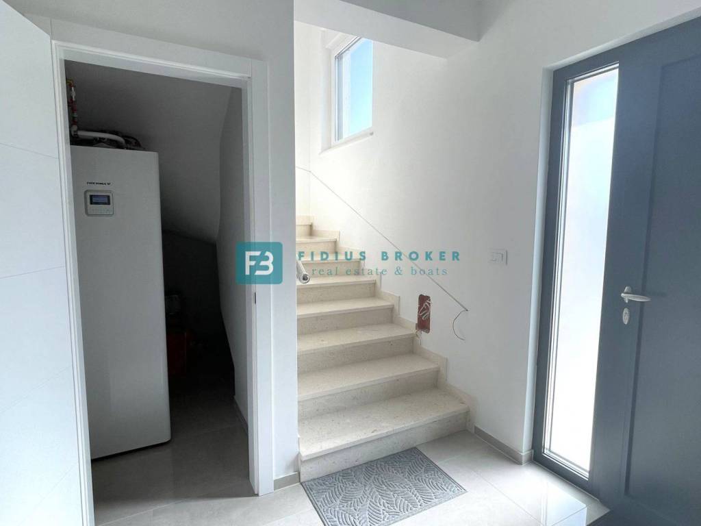 Moderan projekt, atraktivnog dizajna s pogledom na more. Za gradnju su korišteni kvalitetni materijali te je ugrađena vrhunska oprema: stiropor fasada 10 cm, protuprovalna i protupožarna ulazna vrata, ALU stolarija, podizno klizne stijene, električne rolete, ugrađeni komarnici, podno vodeno grijanje kroz cijelu kuću (grijanje putem TOPLOTNE PUMPE), priprema za fotonaponske ćelije i solarne panele, klima uređaj u svakoj prostoriji, moderne sanitarije u kupaonicama, visokokvalitetne keramičke podne obloge, kvalitetan laminat u spavaćim sobama, staklena ograda, stubište obloženo mramorom, bioklimatske pergole na terasama. Kuća je završena i useljiva.