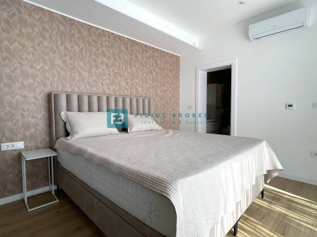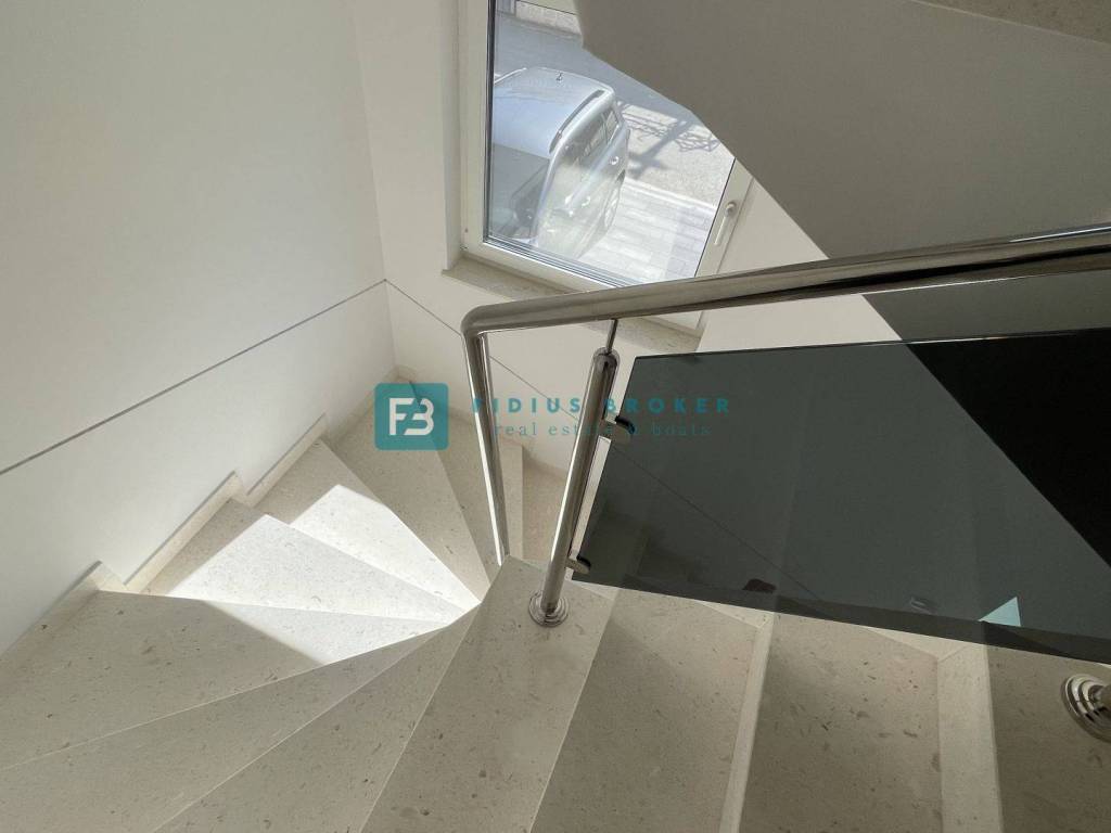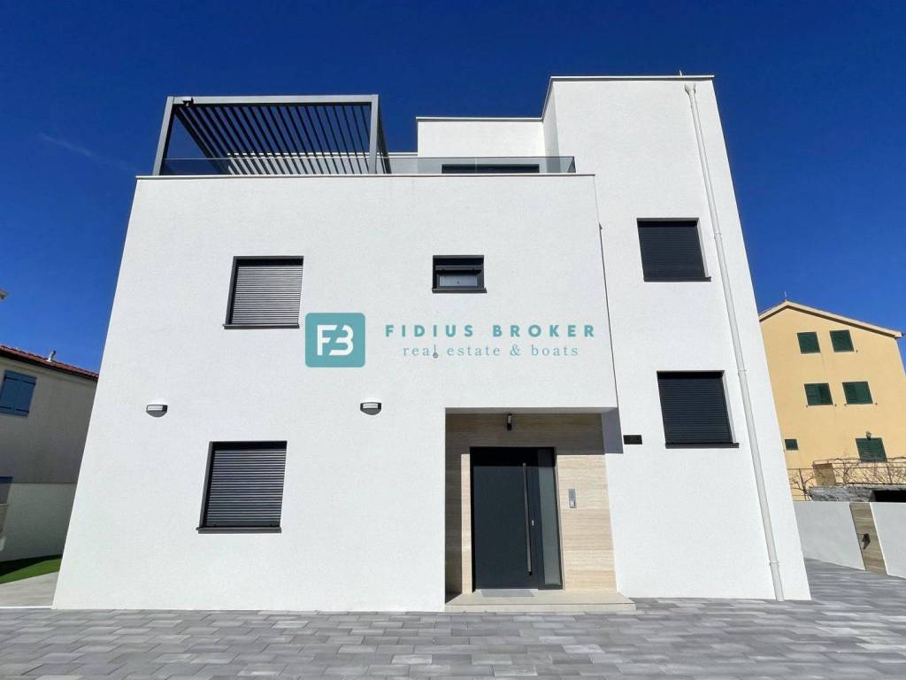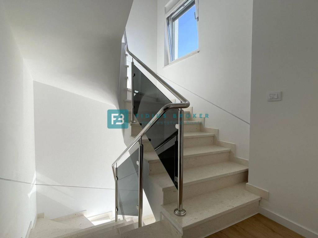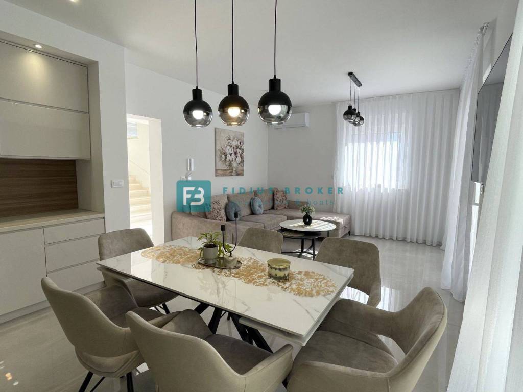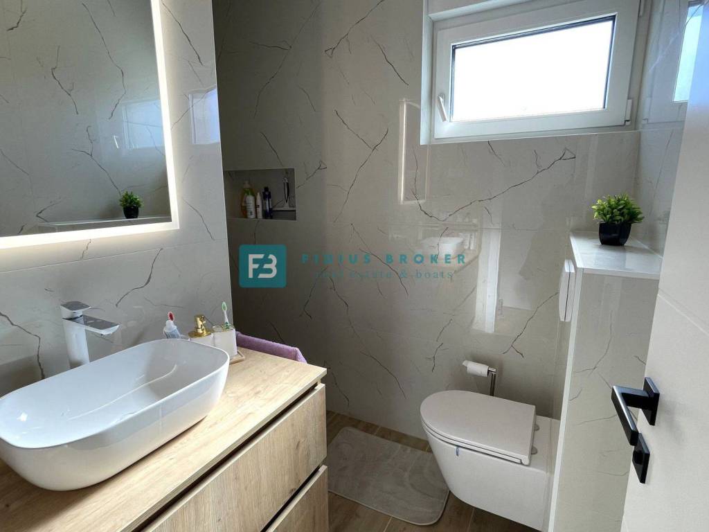 Moderan projekt, atraktivnog dizajna s pogledom na more. Za gradnju su korišteni kvalitetni materijali te je ugrađena vrhunska oprema: stiropor fasada 10 cm, protuprovalna i protupožarna ulazna vrata, ALU stolarija, podizno klizne stijene, električne rolete, ugrađeni komarnici, podno vodeno grijanje kroz cijelu kuću (grijanje putem TOPLOTNE PUMPE), priprema za fotonaponske ćelije i solarne panele, klima uređaj u svakoj prostoriji, moderne sanitarije u kupaonicama, visokokvalitetne keramičke podne obloge, kvalitetan laminat u spavaćim sobama, staklena ograda, stubište obloženo mramorom, bioklimatske pergole na terasama. Kuća je završena i useljiva.