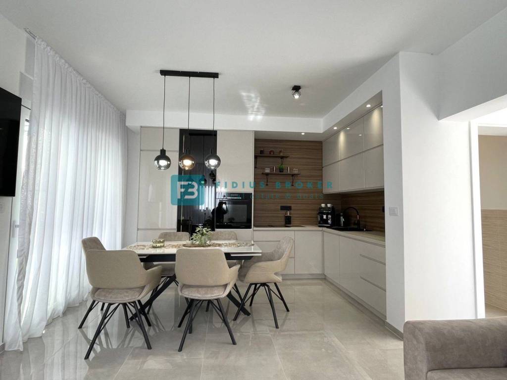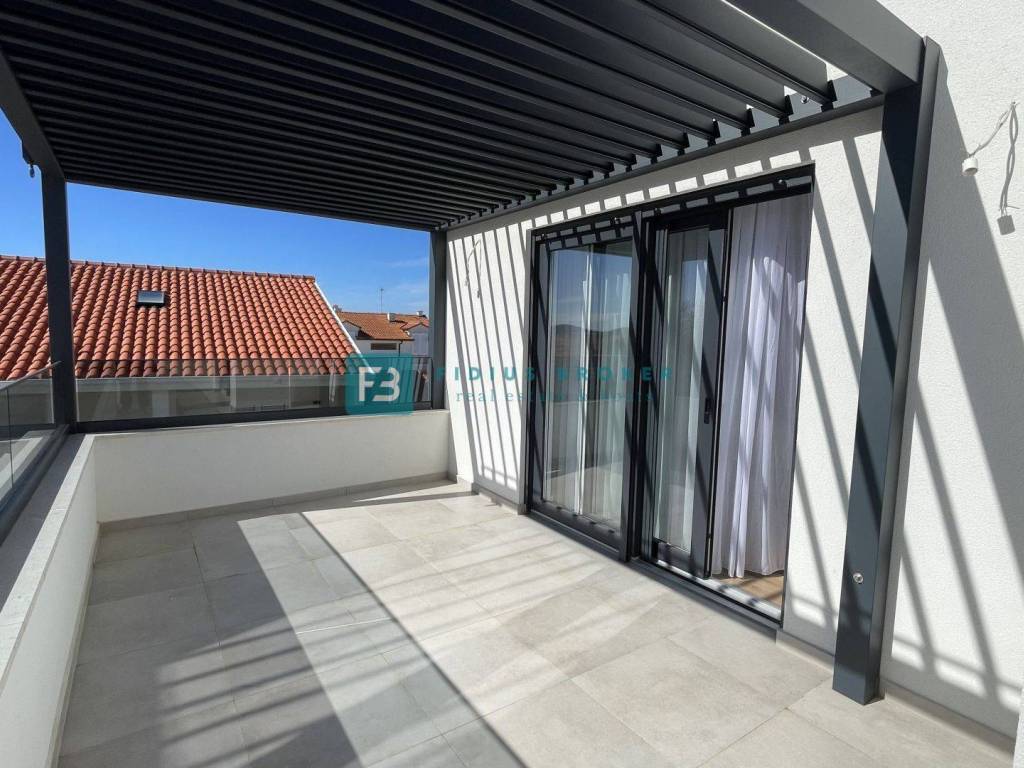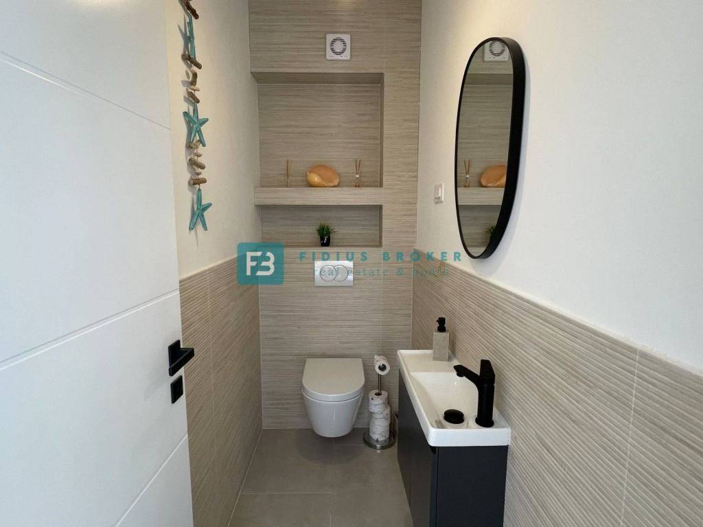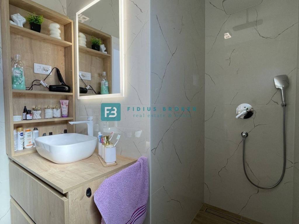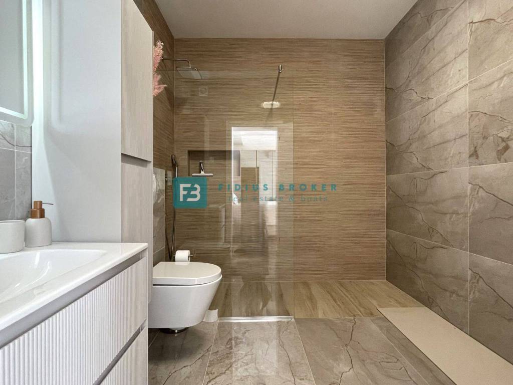 Moderan projekt, atraktivnog dizajna s pogledom na more. Za gradnju su korišteni kvalitetni materijali te je ugrađena vrhunska oprema: stiropor fasada 10 cm, protuprovalna i protupožarna ulazna vrata, ALU stolarija, podizno klizne stijene, električne rolete, ugrađeni komarnici, podno vodeno grijanje kroz cijelu kuću (grijanje putem TOPLOTNE PUMPE), priprema za fotonaponske ćelije i solarne panele, klima uređaj u svakoj prostoriji, moderne sanitarije u kupaonicama, visokokvalitetne keramičke podne obloge, kvalitetan laminat u spavaćim sobama, staklena ograda, stubište obloženo mramorom, bioklimatske pergole na terasama. Kuća je završena i useljiva.