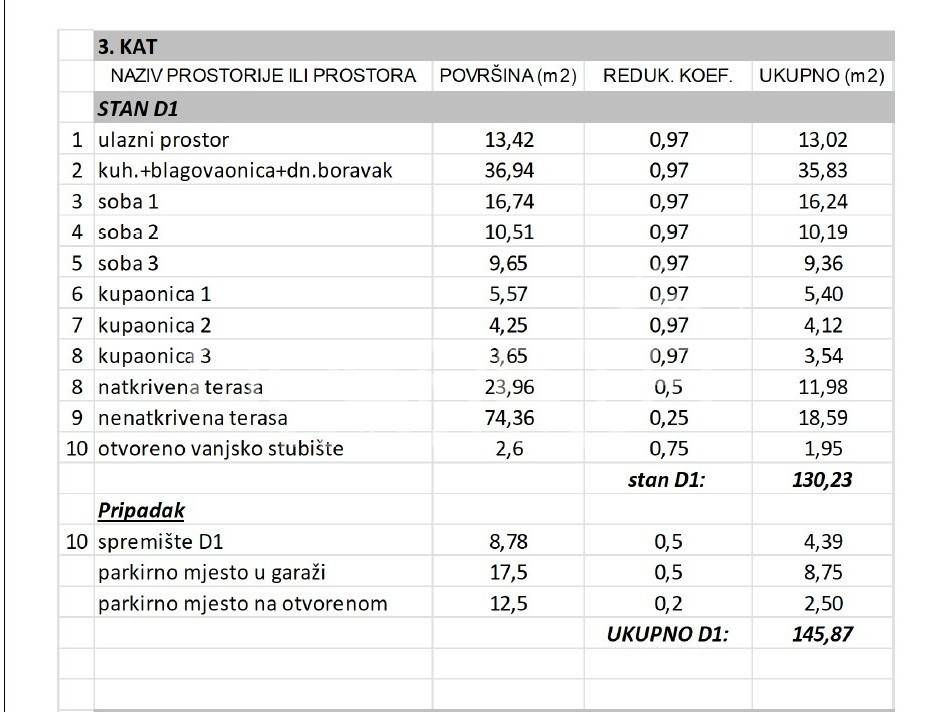 Poseban naglasak stavljen je na vanjski prostor, pa stanu pripada natkrivena terasa površine 24 m te dodatna nenatkrivena terasa od 74 m. Uz stan dolazi i vlastito parkirno mjesto u garaži zgrade, dodatno vanjsko parkirno mjesto te spremište površine 8,78 m.