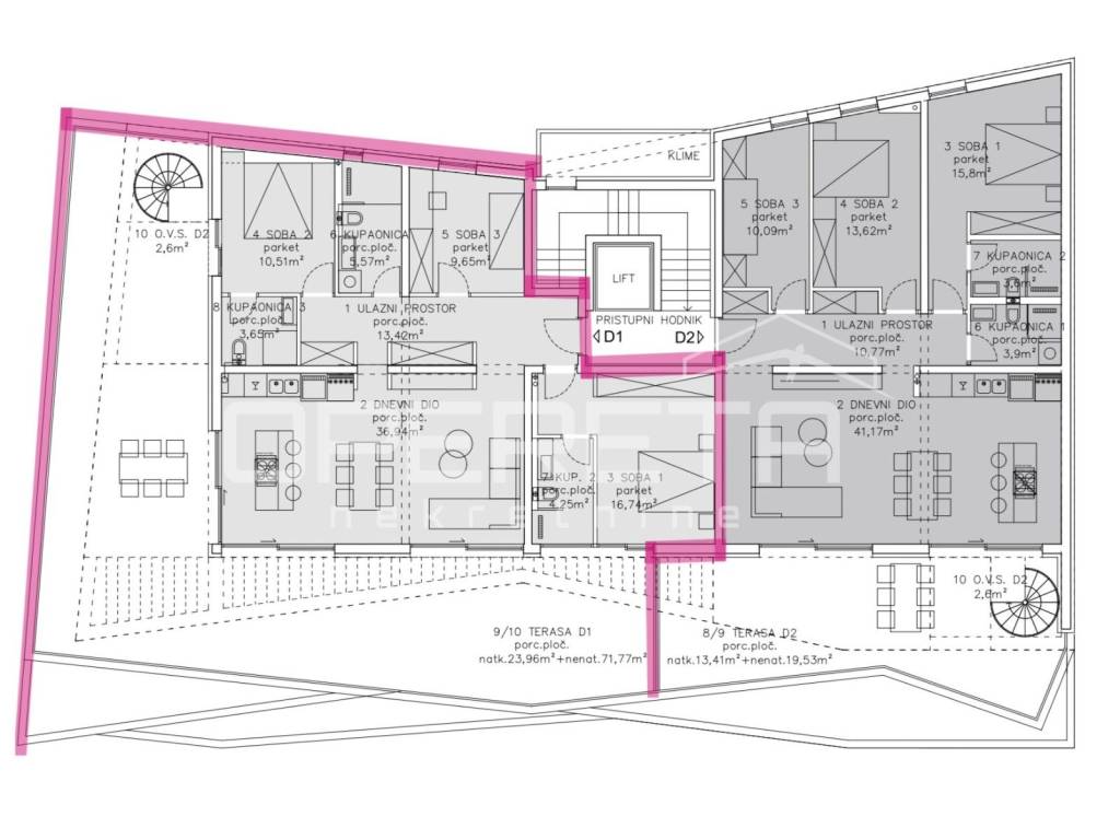 Estetski dojam upotpunjuju staklene ograde na terasama, moderna LED rasvjeta i protuprovalna i protupožarna vrata.
