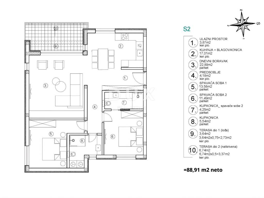 Stan S2 nalazi se na 1. katu manje stambene zgrade s ukupno 5 stanova, ima 82,81 m unutarnje stambene površine (96,26 m obračunske površine). Južna orijentacija osigurava cjelodnevnu osvijetljenost i ugodan boravak tijekom svih godišnjih doba.