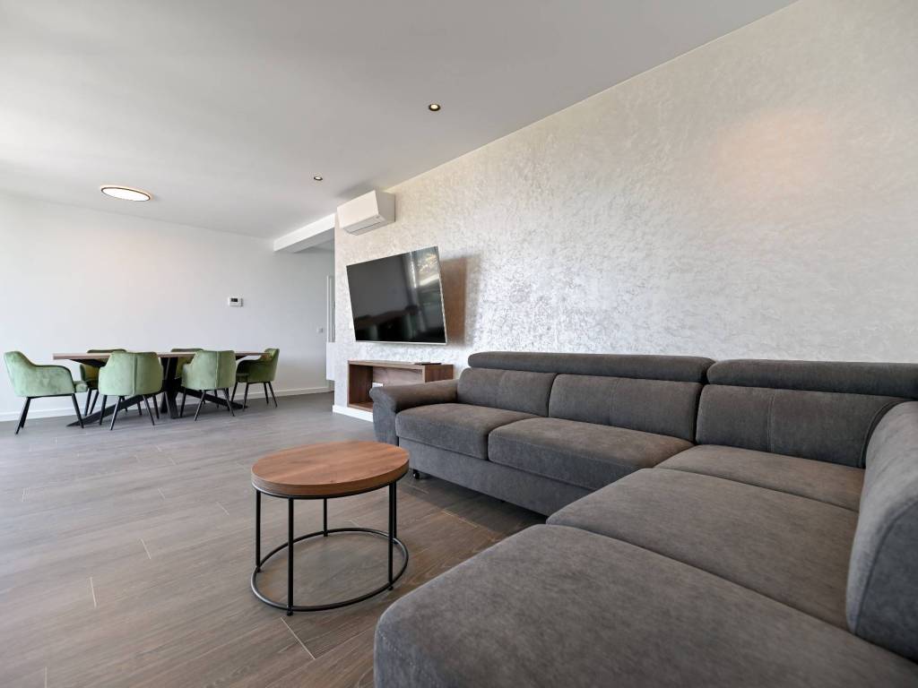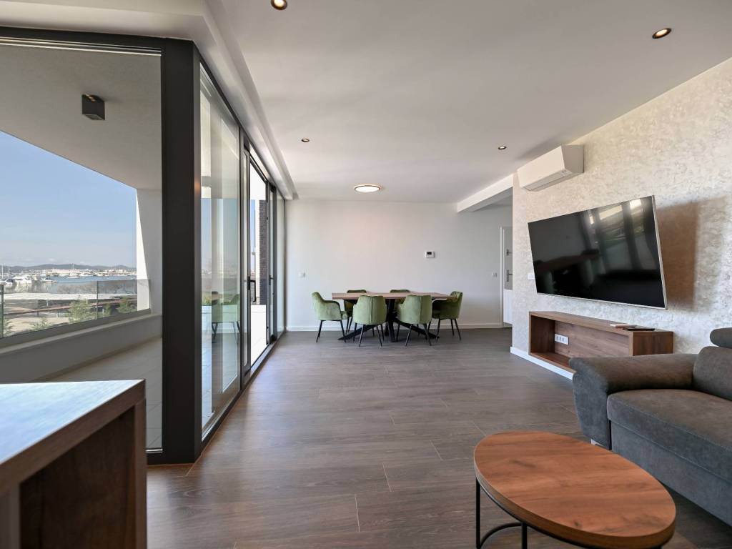 Opis stana: Stan se sastoji od prostranog open-space prostora koji povezuje dnevni boravak, blagovaonicu i potpuno opremljenu kuhinju. Iz dnevnog boravka postoji direktan izlaz na veliki balkon s pogledom na more. Stan uključuje: - glavnu spavaću sobu s vlastitom kupaonicom - dvije dodatne spavaće sobe s izlazom na balkon - modernu kupaonicu - dodatni gostinjski WC - utility / praonicu