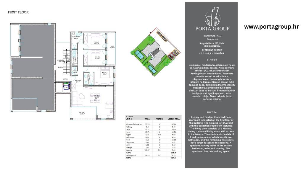 Moderno i luksuzno namješten stan "B4" u ekskluzivnom projektu Porta Sukošan Residence, smješten na adresi Zdravolac 80, Sukošan, samo 50 metara od mora na jednoj od najpoželjnijih lokacija u blizini Zadra. Stan "B4" nudi savršenu kombinaciju udobnosti, funkcionalnosti i vrhunskog mediteranskog načina života. Nalazi se na prvom katu zgrade B te je idealan za stanovanje, odmor ili investiciju.