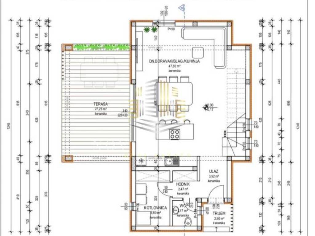 U prizemlju se nalazi prostrani open-space dnevni boravak s kuhinjom i blagovaonicom (cca 47,8 m²), koji je ispunjen prirodnim svjetlom i povezan s vanjskom terasom. Velike staklene stijene vode na natkrivenu terasu od cca 27 m², idealnu za druženje i uživanje uz bazen.