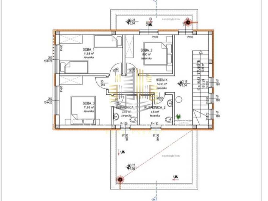 Na katu su smještene tri udobne spavaće sobe (svaka cca 11,8 m²), što omogućava idealan raspored za obitelj ili goste.